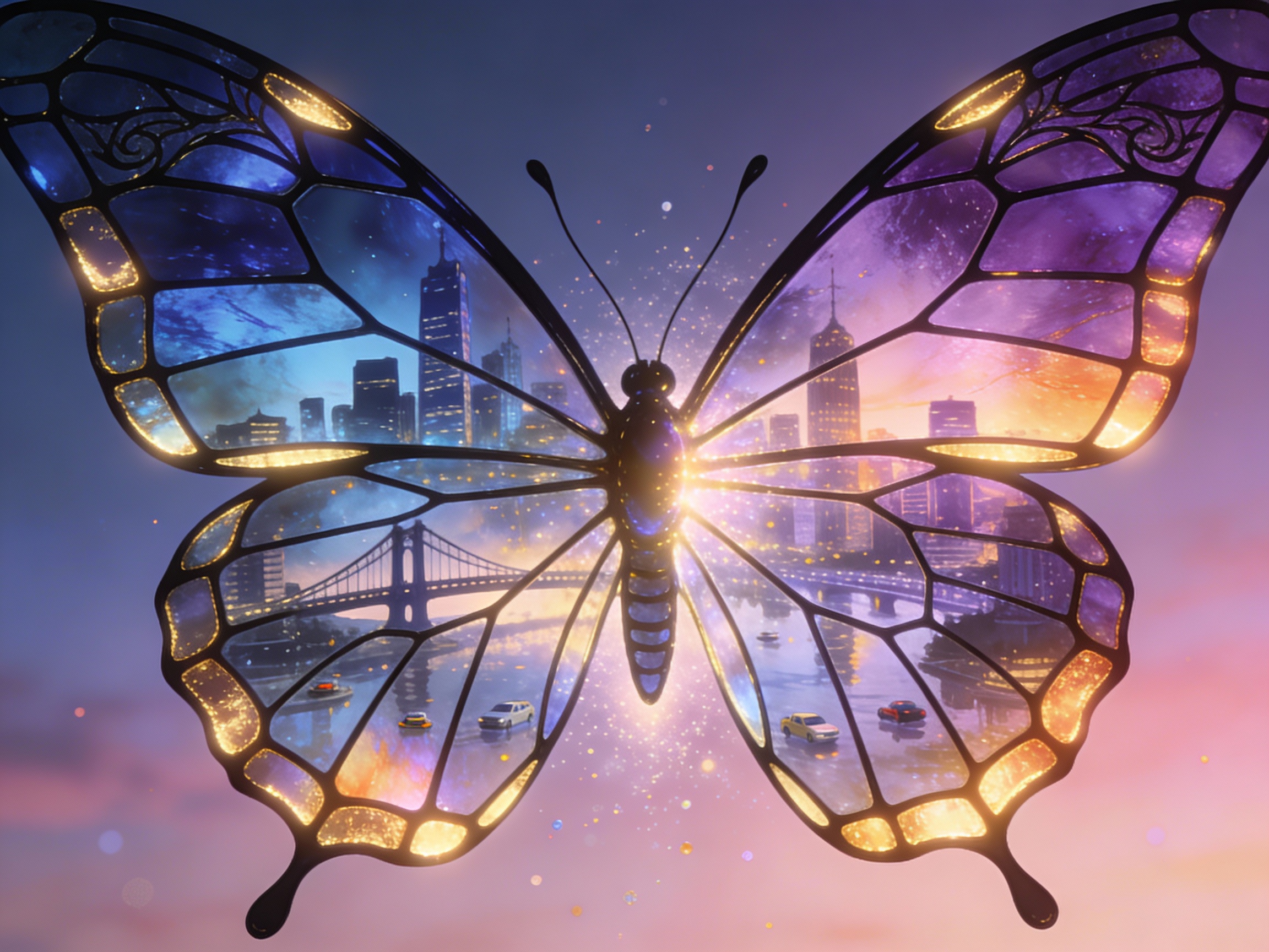 Prompt 2: A butterfly with stained-glass wings reflecting miniature cityscapes, glowing edges, intricate linework, symbolic transformation.