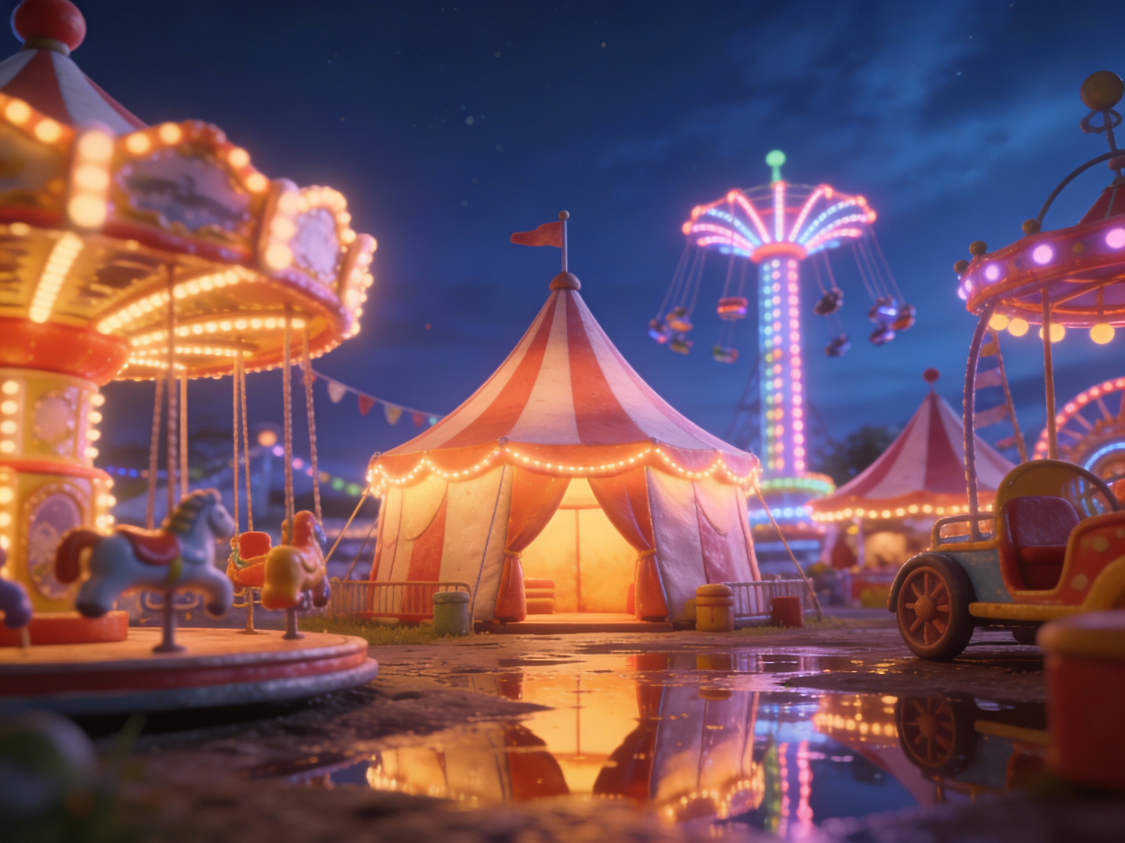 Prompt 3: 3D render, tiny carnival at night, glowing tents and rides, deep blue sky, reflections on puddles, whimsical cozy mood.