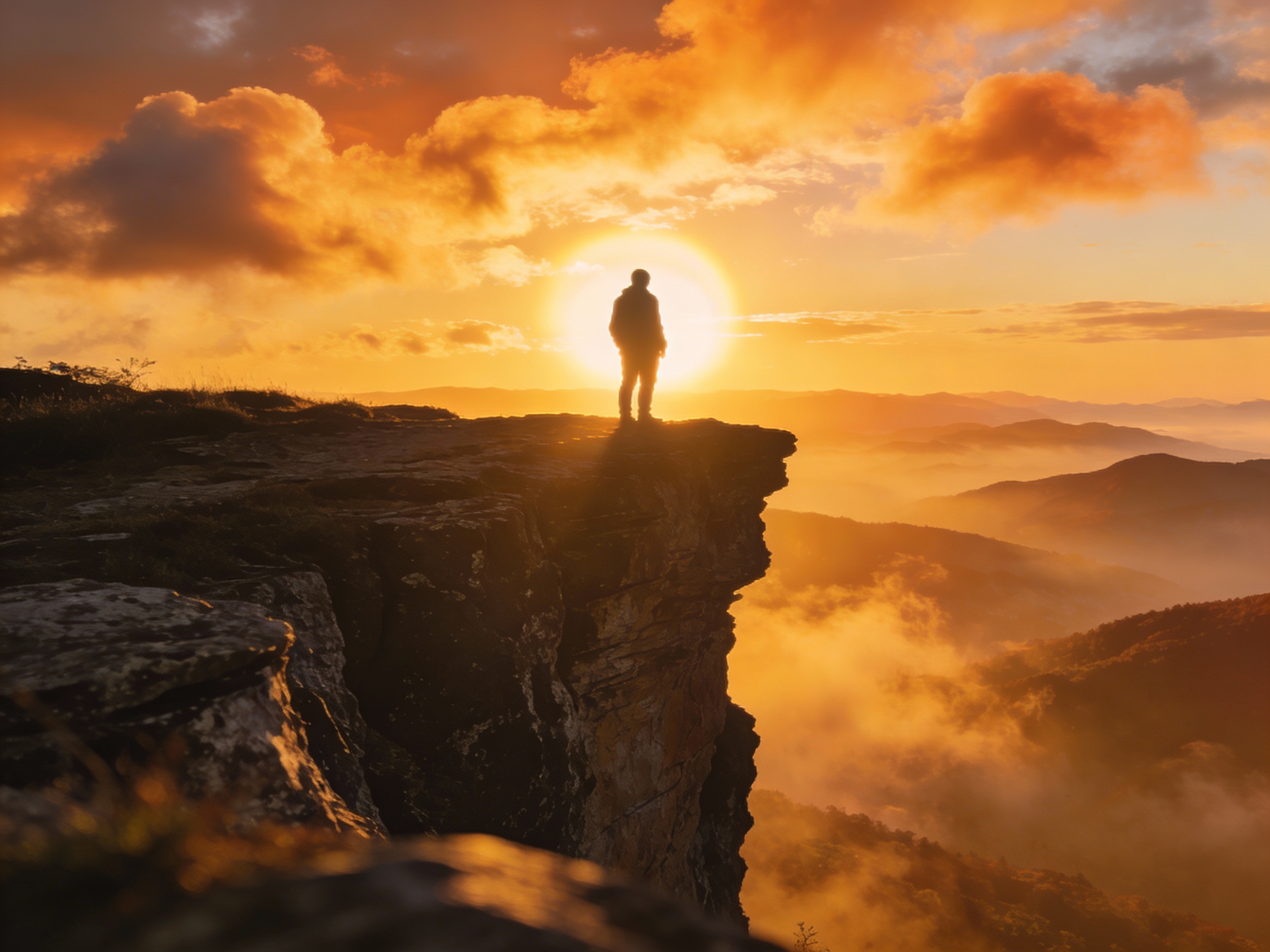 Prompt 1: A lone figure standing on a cliff at sunrise, wide-angle shot, golden hour lighting, epic atmosphere.