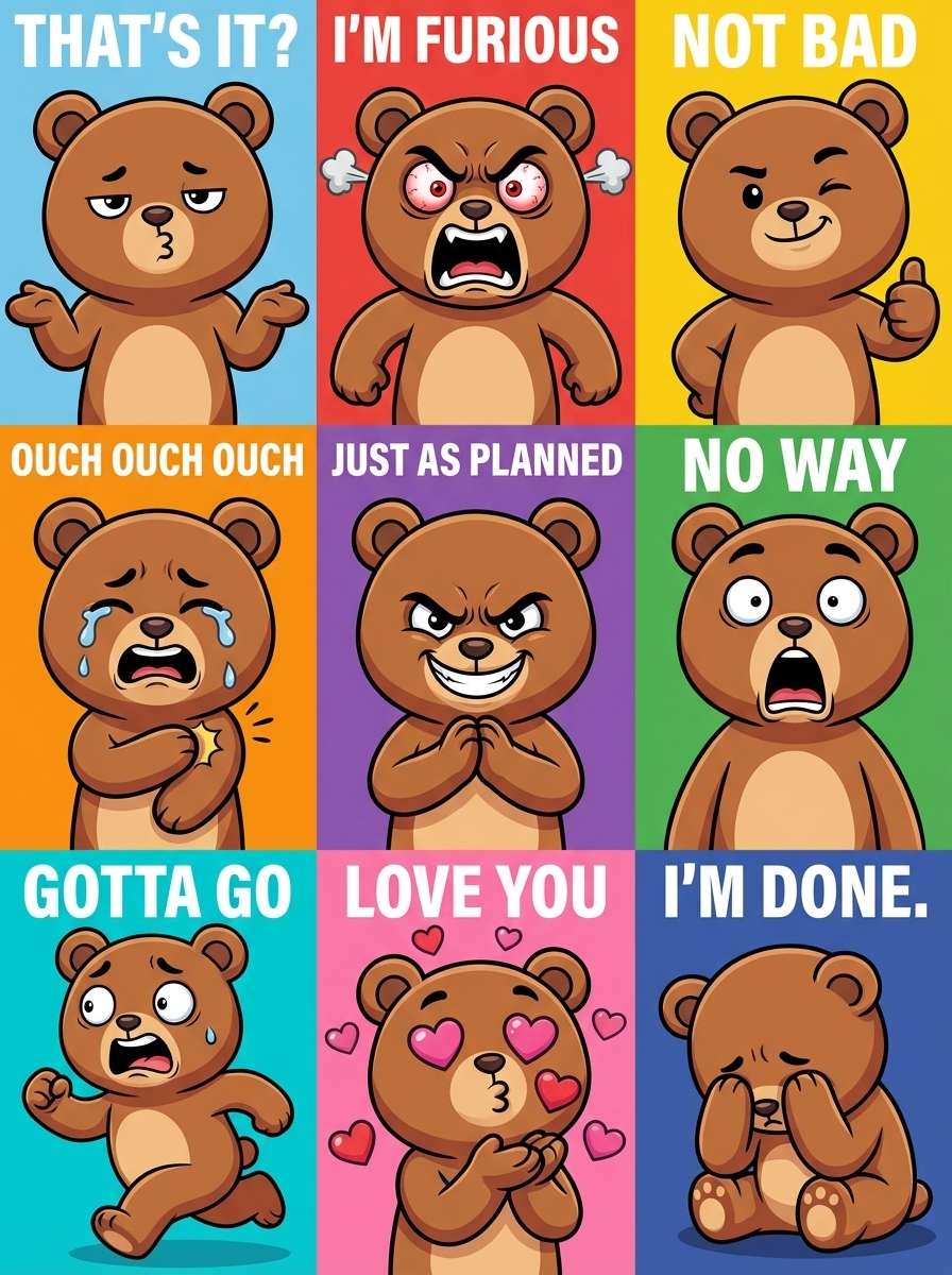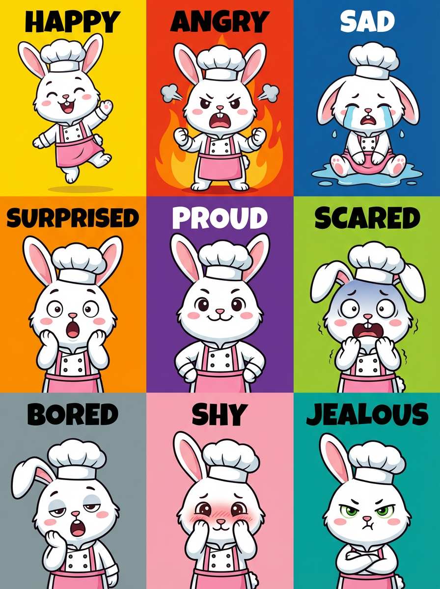 Clearly specify the action for each grid using keywords, such as 'Grid 1 [smile], Grid 2 [frown], Grid 3 [peace sign]', and add the prompt 'Actions should be natural and match the character's body features.'