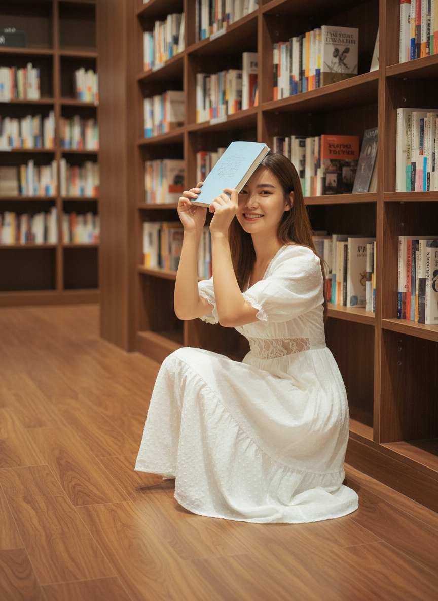 The prompt is clear: 'Warm-toned natural light streams through the bookstore's glass windows, softly illuminating the characters' faces, while the bookshelves and books retain the texture of wood and pages.' Add: 'Slightly blur the background (shallow depth of field)' to avoid a cluttered scene or disconnect between the characters and the setting.