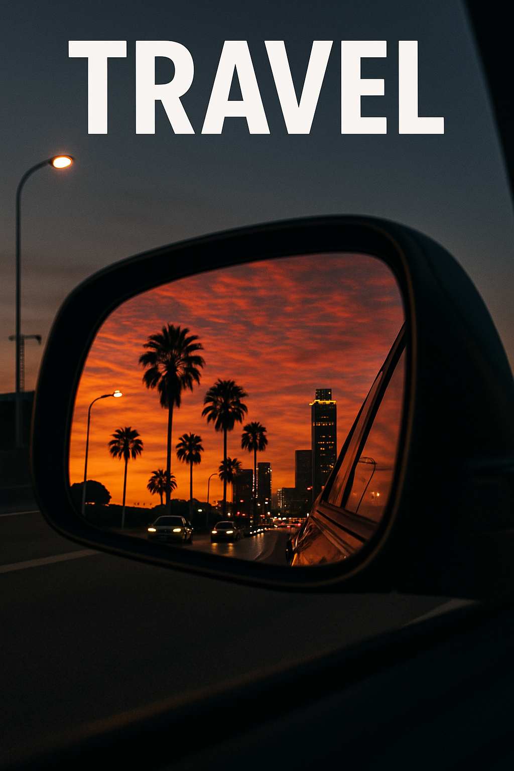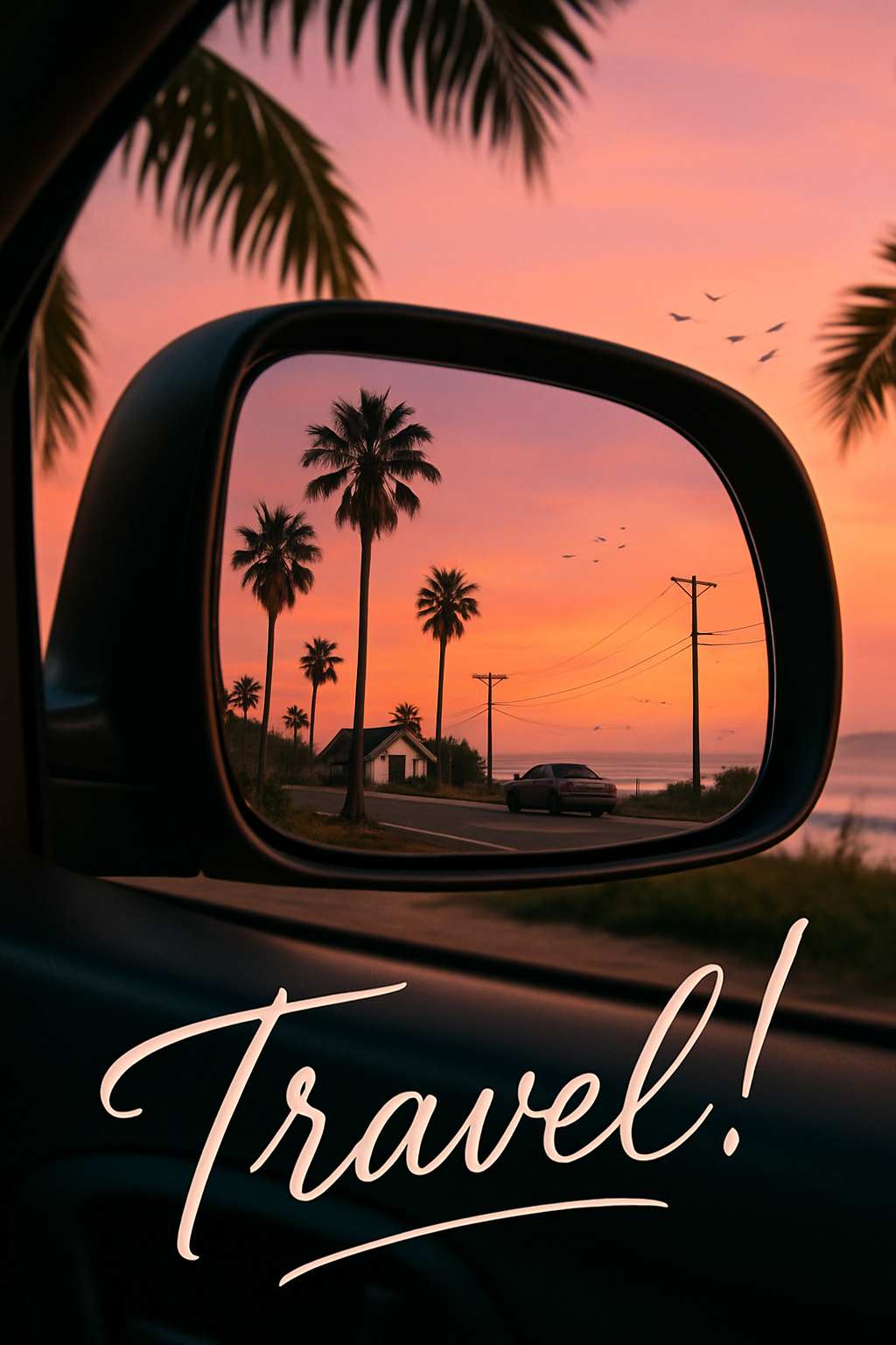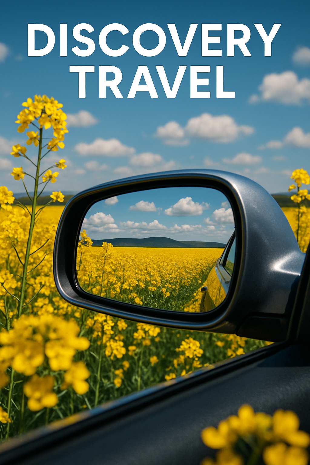 Prompt Structure: “A travel poster design. The central focus is the view through a car's rearview mirror, showing [your desired landscape]. The mirror's frame is visible, with subtle reflections of the [car interior details, e.g., dashboard, steering wheel]. The style is [e.g., vintage 1950s travel poster].”