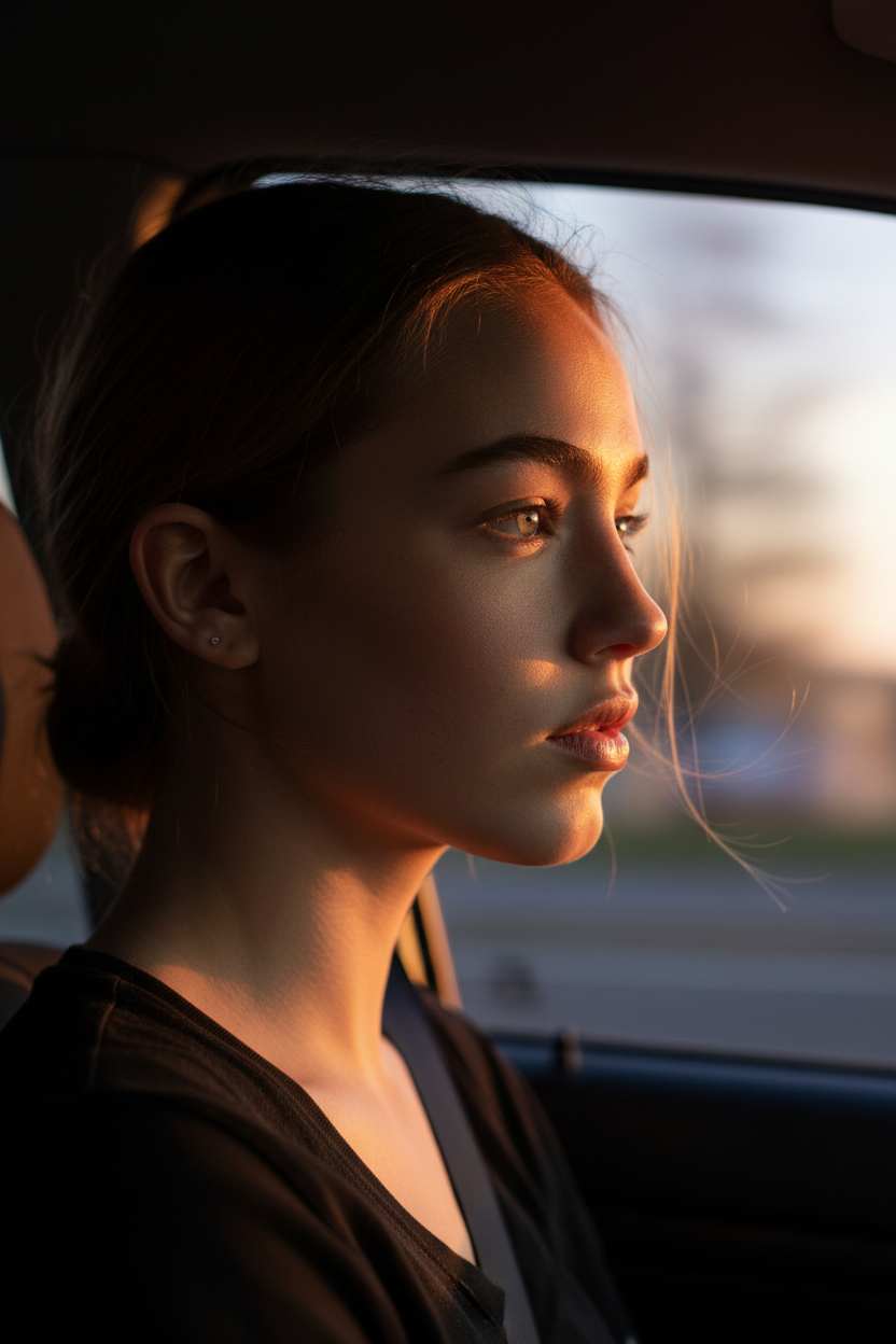 Dreamy & Cinematic Car Window Atmosphere Photo Golden Hour Travel Portrait AI Image Generator