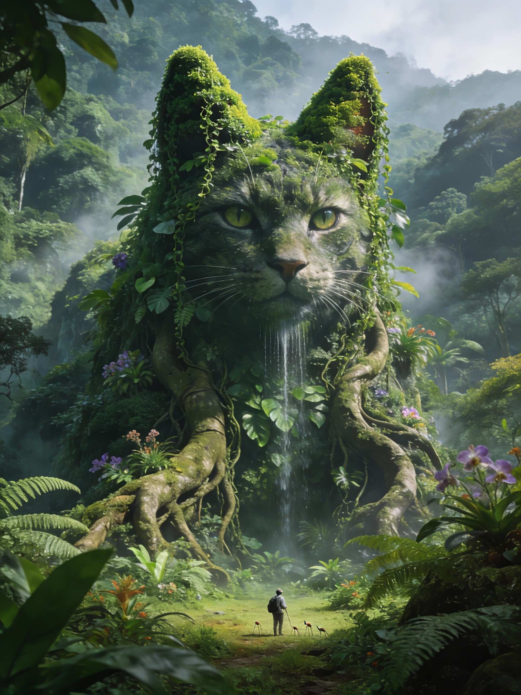 Sophisticated AI uses techniques from landscape photography and geological formation patterns. It integrates the feline shape using believable erosion patterns, vegetation cover that follows the form, and realistic lighting that casts shadows consistent with the 3D shape of the "cat-mountain," making the illusion seamless and organic.