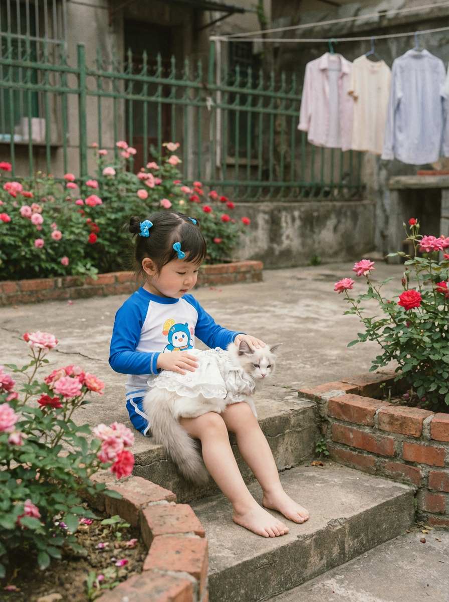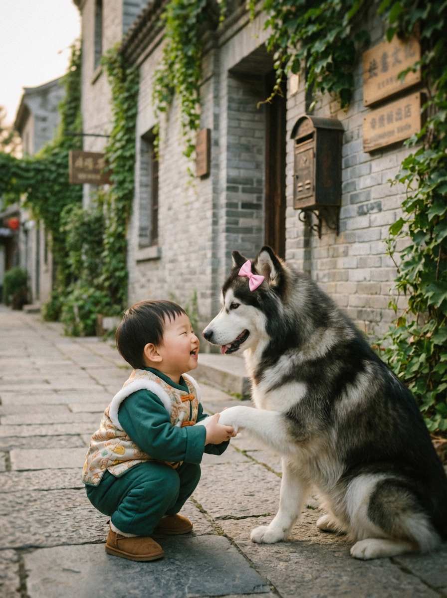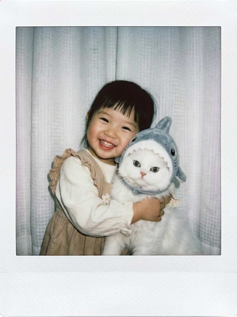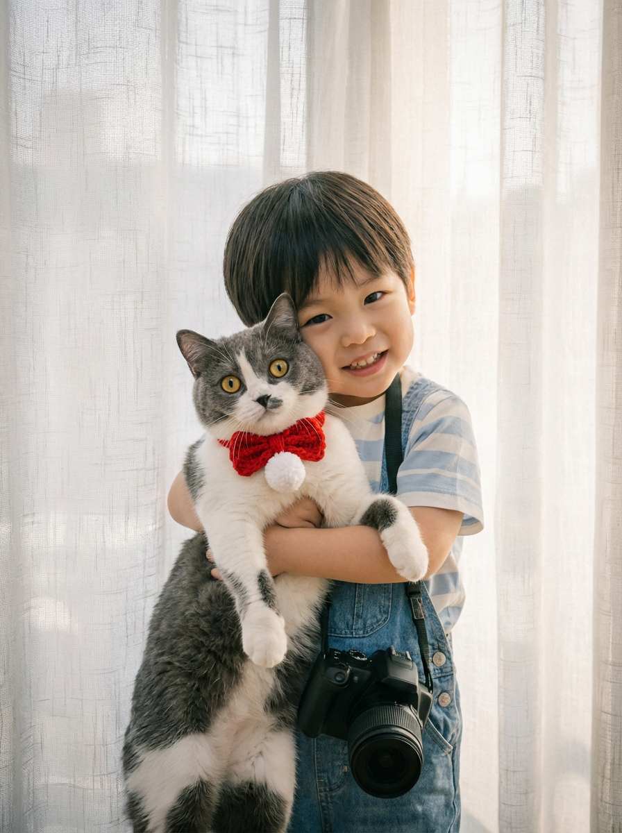 The prompt clearly states: 'Childhood self (6-8 years old body shape) naturally hugging a pet (scaled according to the real breed), with movements matching a child holding a pet.' It also adds: 'Unified lighting and shadows (such as warm natural light), with soft edge transitions,' avoiding disproportion or signs of compositing.