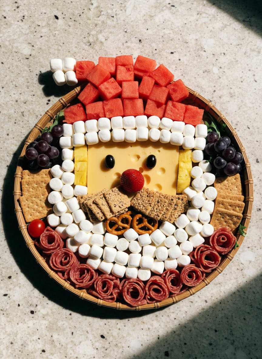 Use AI to create Santa or Christmas-themed arrangements with fruits, cheese, cookies, snacks, and salami, crafting a visually stunning platter exclusively for your Christmas party.