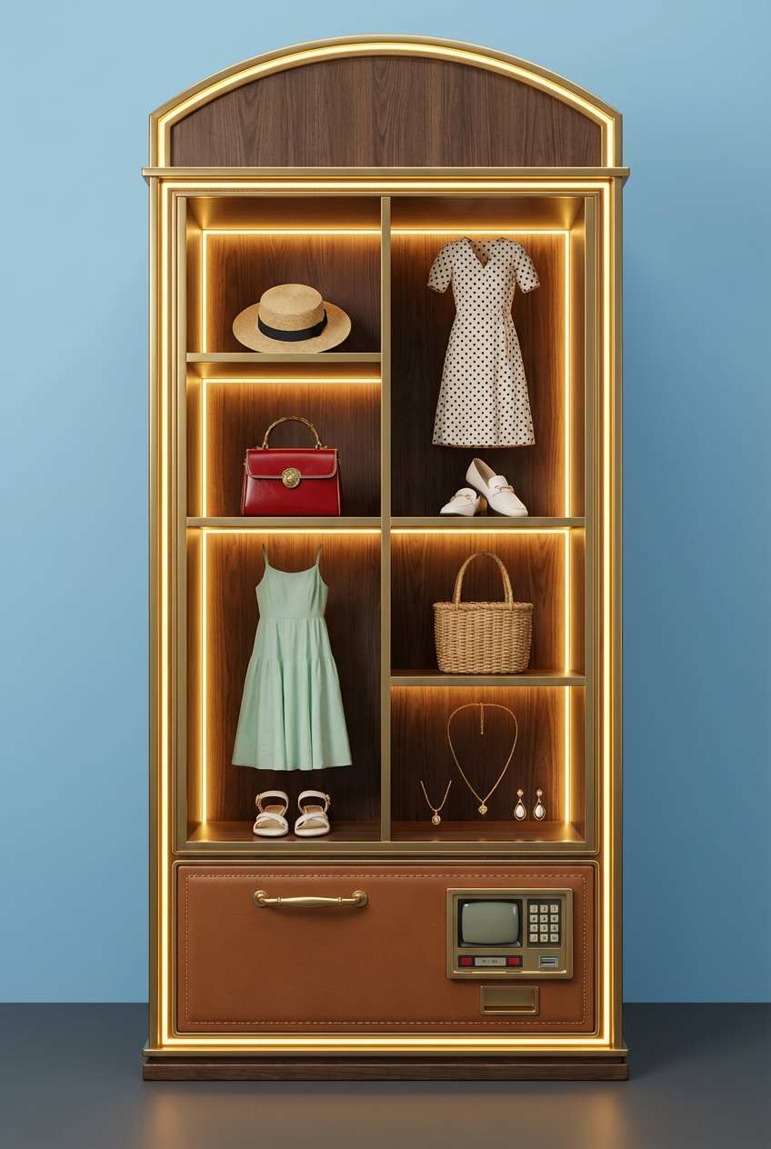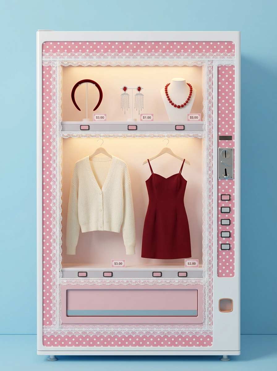 The prompt clearly states: 'In the vending machine's product compartments, display and upload the complete outfit, preserving [fabric texture / accessory details],' with the addition: 'Vending machine appearance [futuristic transparent cabin / retro neon style], ensuring the outfit's proportion matches the cabin,' avoiding distortion of details.