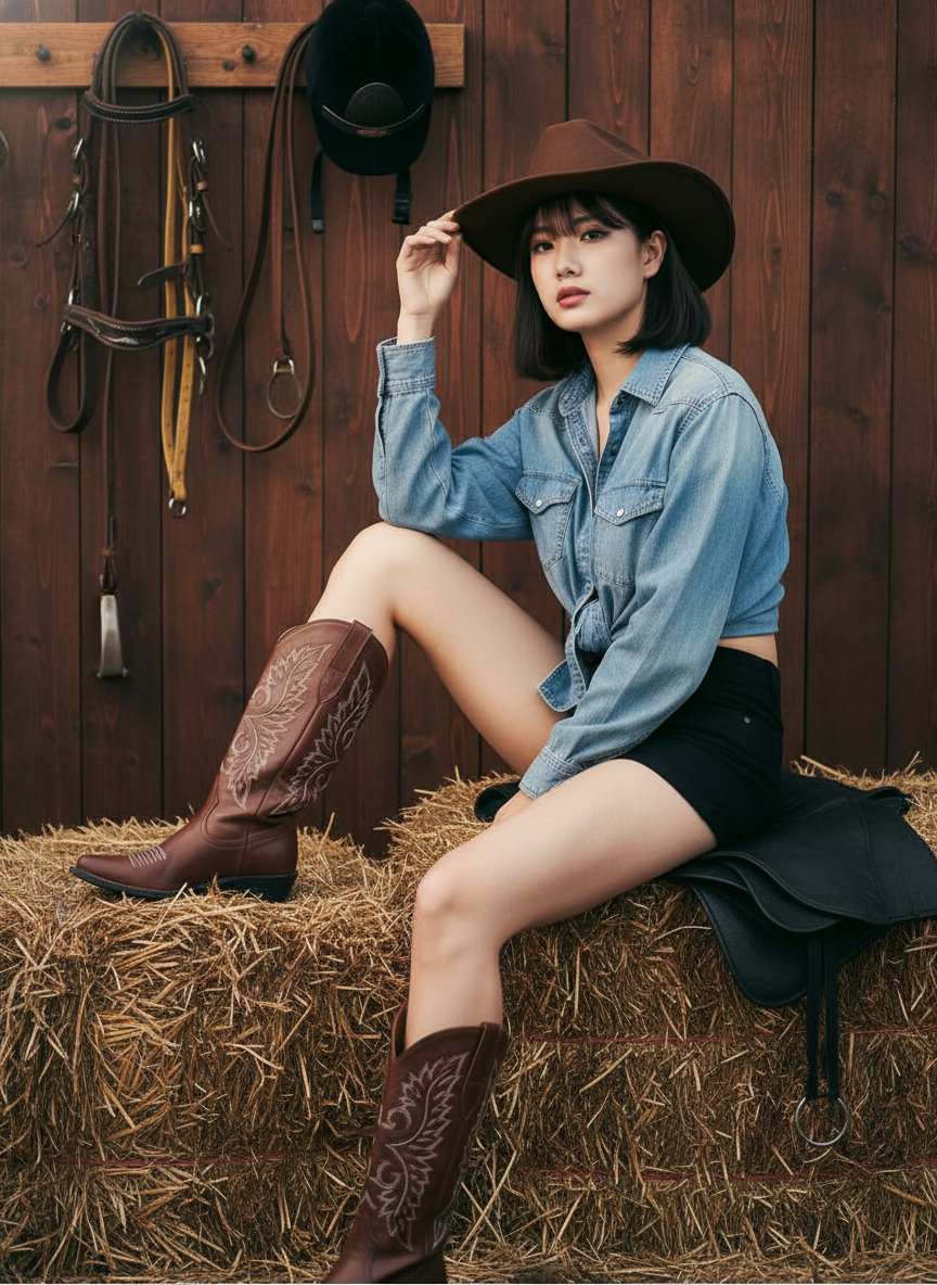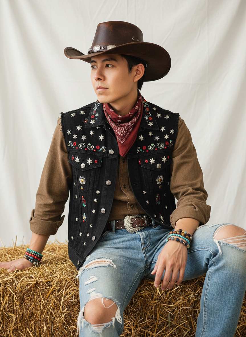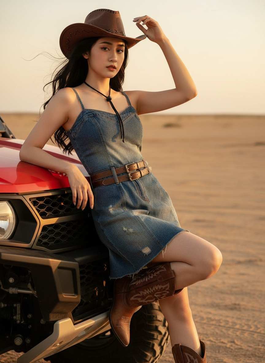 Cowboy-style photography is a genre centered around cowboy elements, showcasing styles of freedom, casualness, and cool confidence. It typically creates unique visual effects and atmospheres through cowboy attire, accessories, as well as specific scenes, poses, and shooting techniques.
