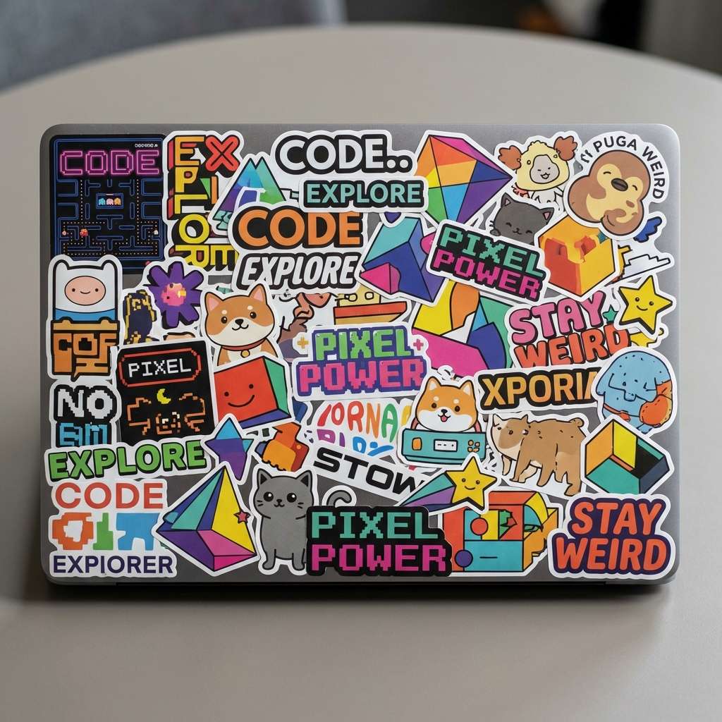 Core elements include playful, approachable visuals (e.g., chibi characters, tiny animals, pastel patterns, retro tech motifs), clean, crisp outlines (for easy peeling and application), compact sizing optimized for laptop surfaces, and vibrant yet cohesive color palettes (soft pastels, bold neons, or muted neutrals). The designs also prioritize scalability, ensuring details stay sharp whether printed as small decals or larger laptop stickers.