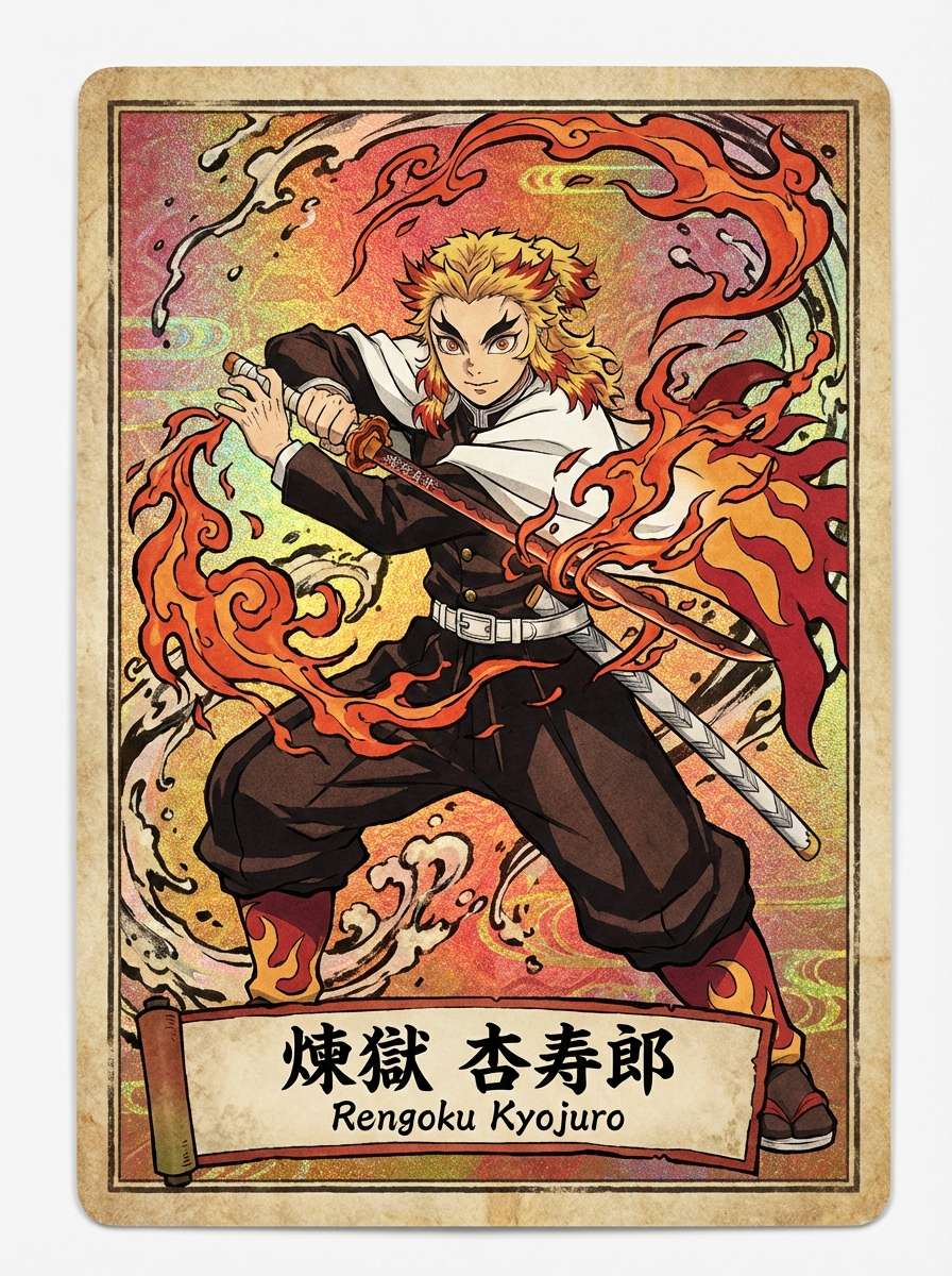 Yes. You can create themed card sets (e.g., “Hashira Collection,” “Upper Moon Demons Set,” “Breathing Styles Series”) with consistent ukiyo-e sub-styles, color palettes, and border designs. The AI ensures visual cohesion across the set—for example, using matching cherry blossom borders and indigo/red color schemes for all Hashira cards—making the collection feel curated and valuable to collectors.