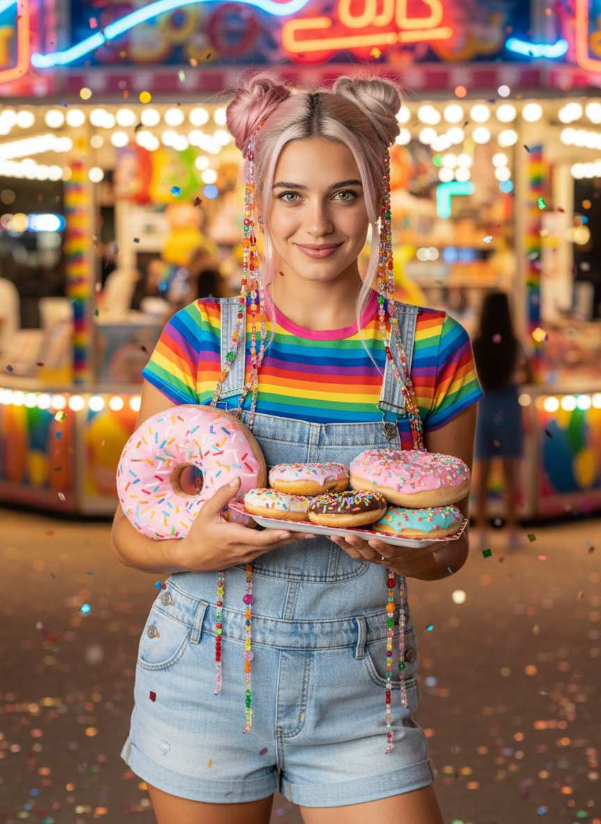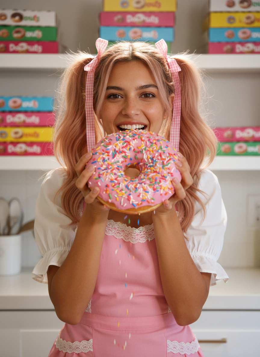 Fantasy Scenes: Sitting in a donut swing, floating in a sprinkle-filled room, or other surreal, sweet-themed environments.