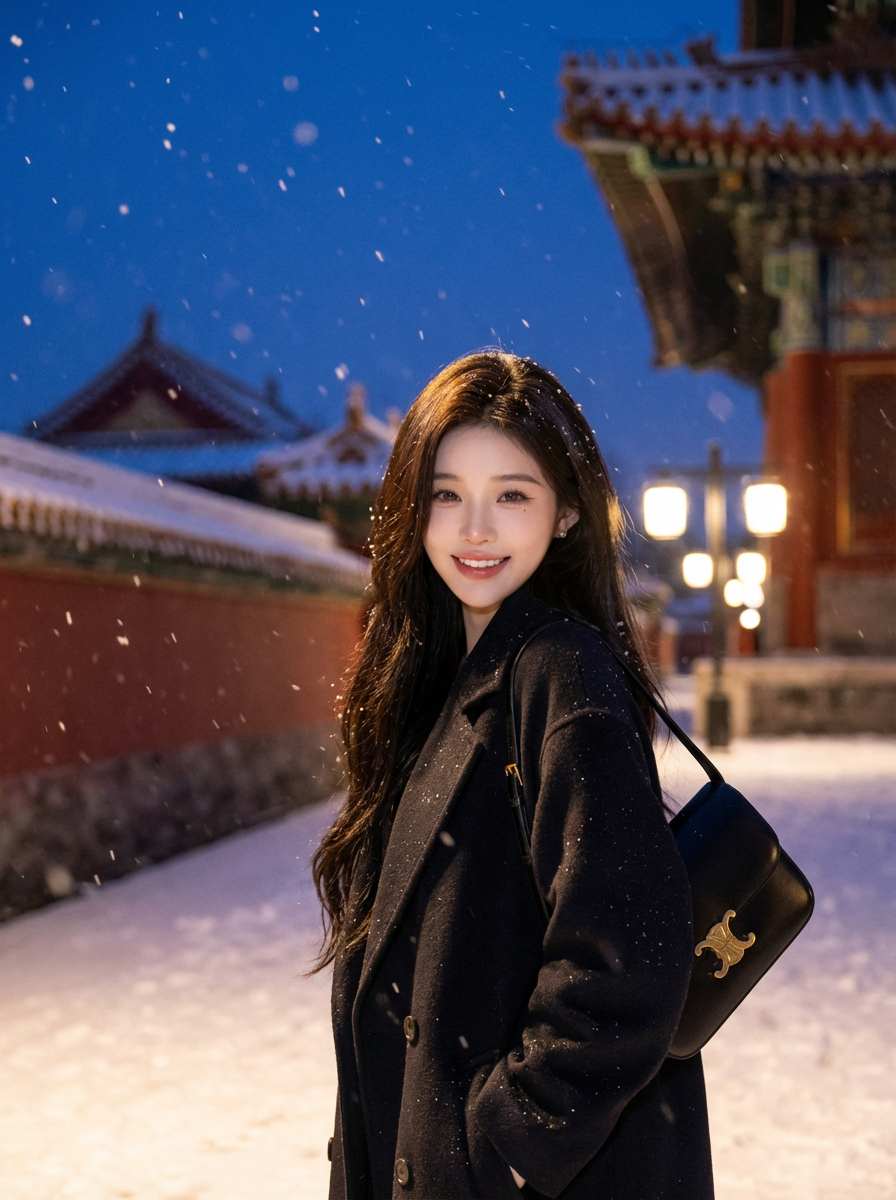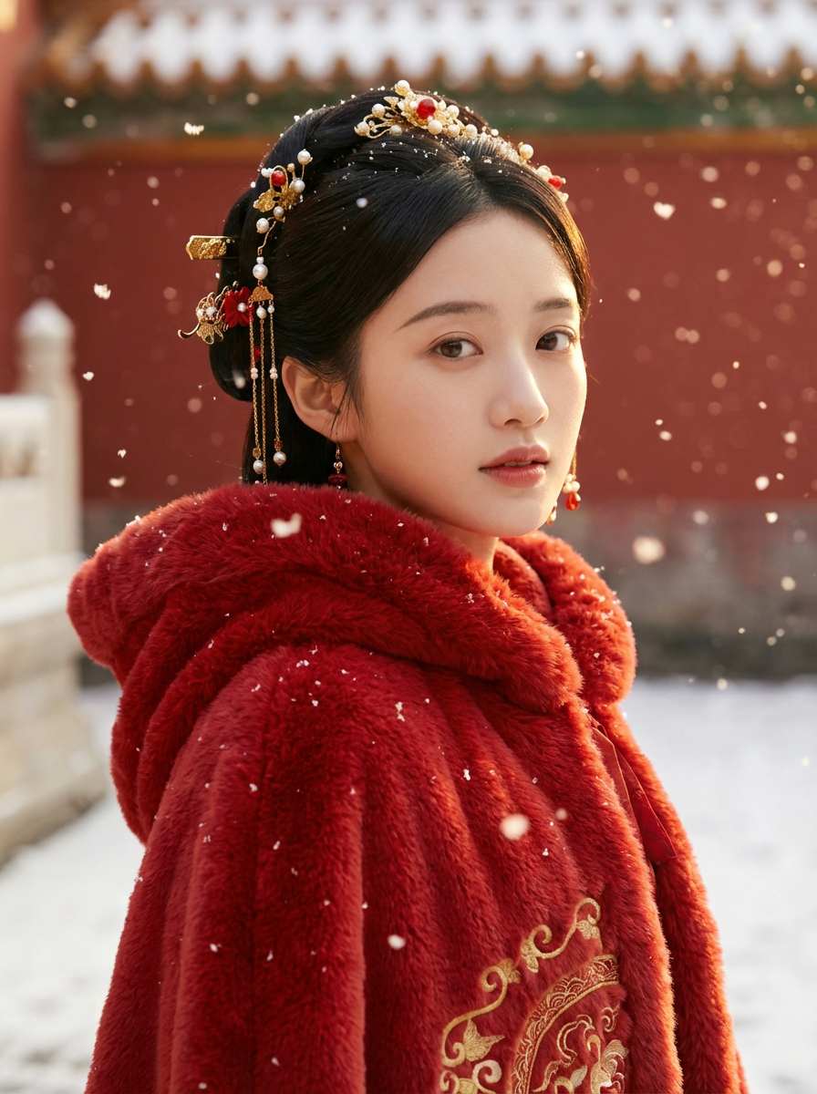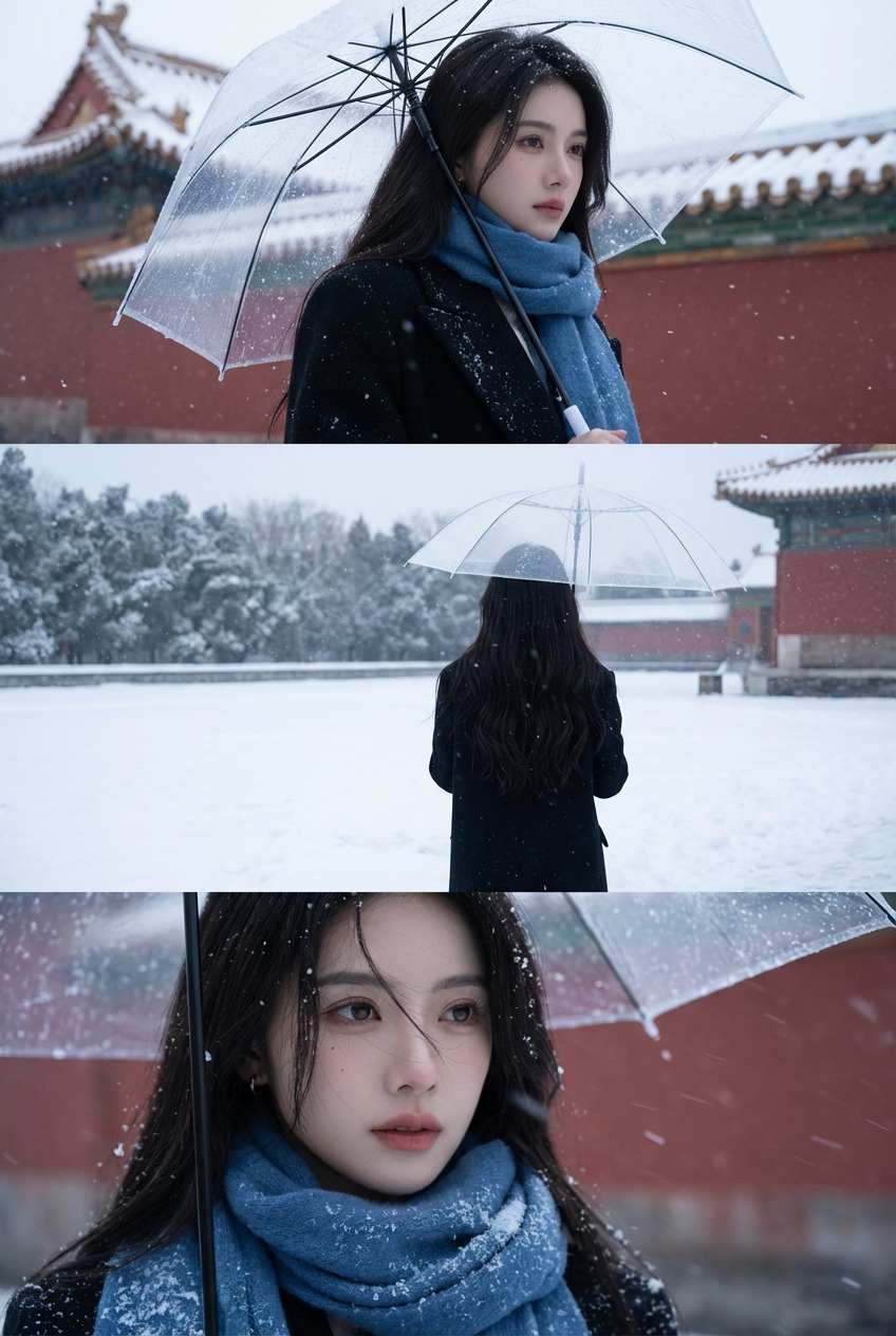 Taking the snow scenery of the Forbidden City in Beijing as the background, combined with photography/creative theme works featuring characters in the mirror, the core is to integrate the solemn and ancient charm of the ancient architecture of the Forbidden City with the pure poetry of the first snow, creating a portrait image that combines atmosphere and culture.