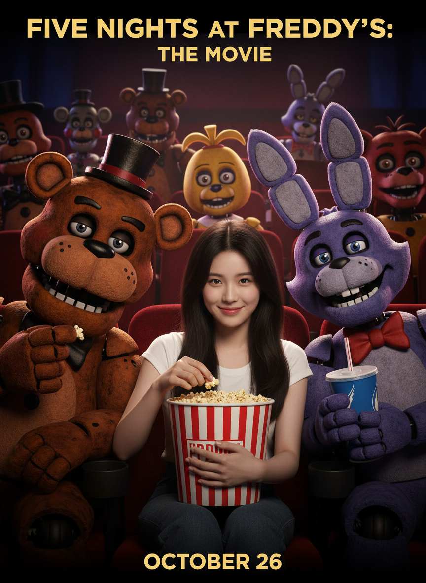 Create custom group photos with Five Nights at Freddy's characters using AI. Generate eerie animatronic squad images and poster scenes.