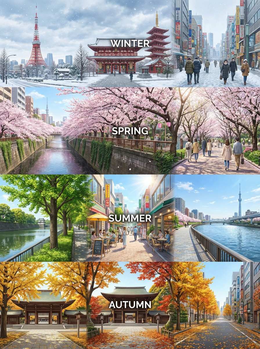 It’s an AI image generation tool or technique specifically used to create a cohesive series of four images depicting the same city scene as it would appear in spring, summer, fall, and winter. The focus is on maintaining a consistent viewpoint and core architecture while transforming the seasonal elements like foliage, lighting, weather, and human activity to tell a visual story of time passing.