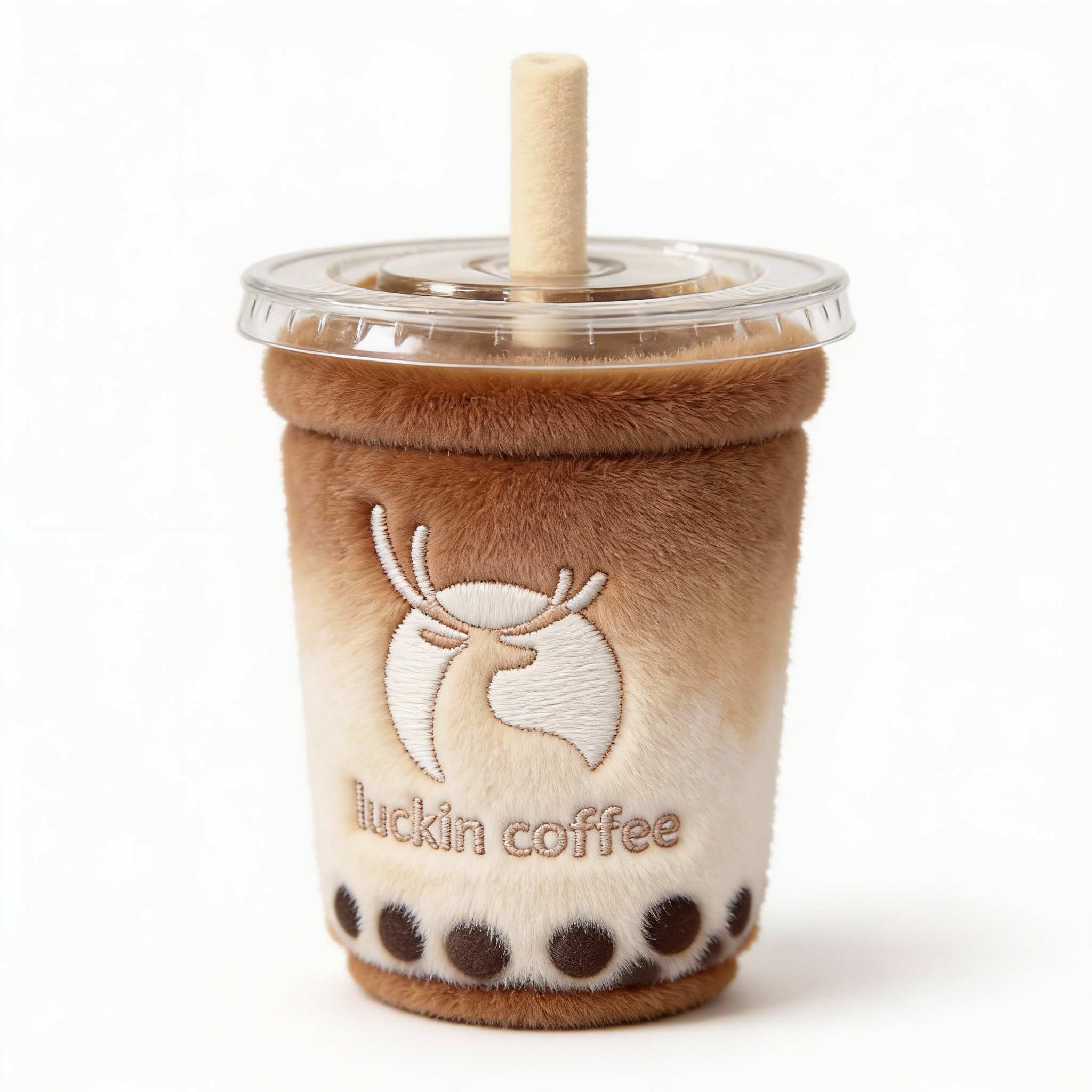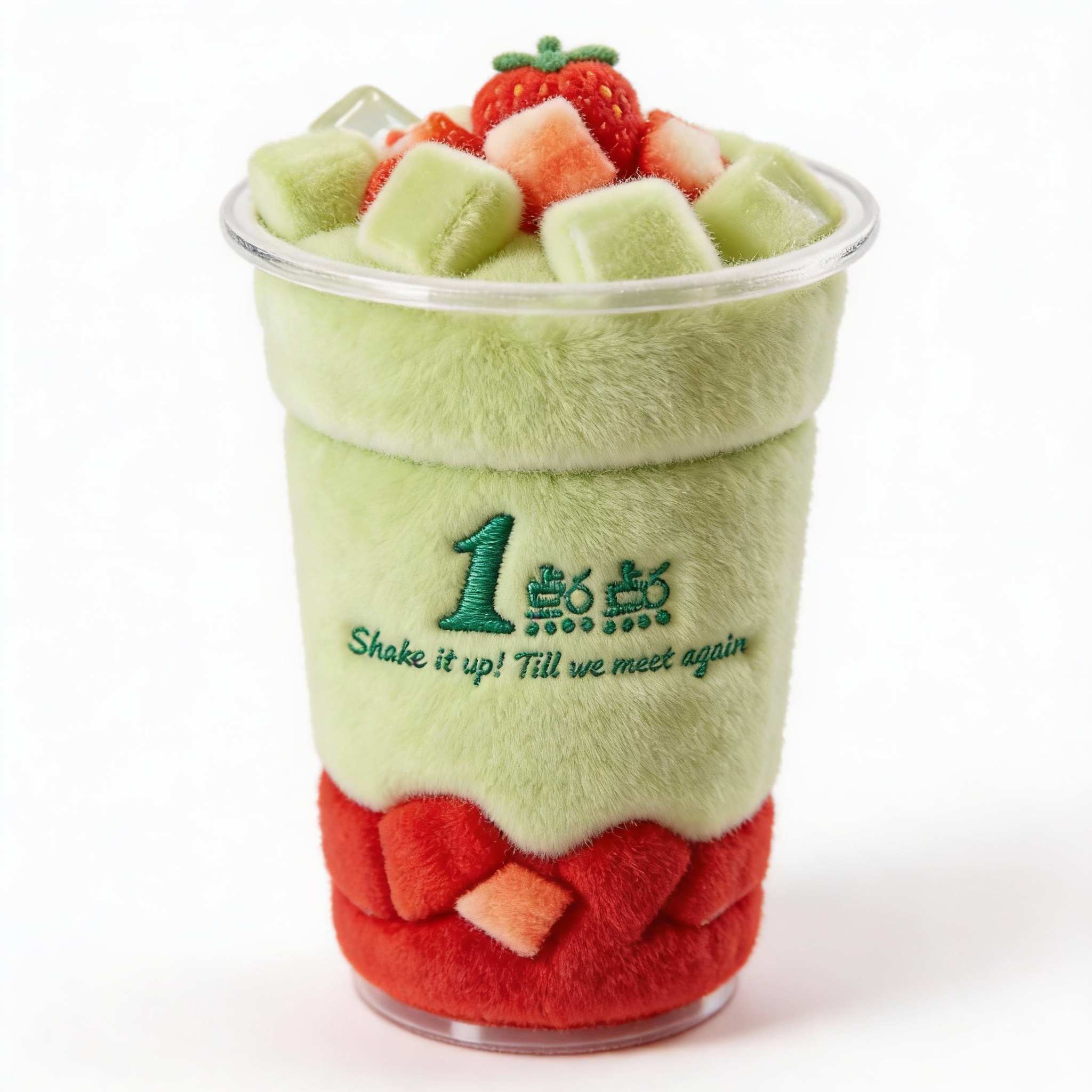 Pure Plush Toy: “A stuffed animal plushie in the shape of a milk tea cup with cartoonish embroidered eyes and a smile. No functional parts, purely decorative.”
