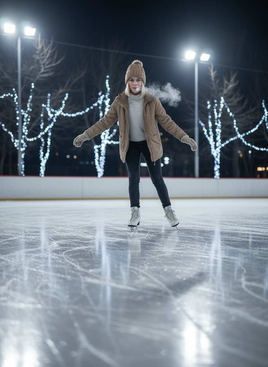 Sure, label the prompt with 'Atmosphere as [tranquil snowy morning / lively night festival]', shooting perspective as [aerial view / ground-level close-up]', and add 'people as accents (such as skaters / market visitors)' to enhance the immersive feeling of a winter wonderland.