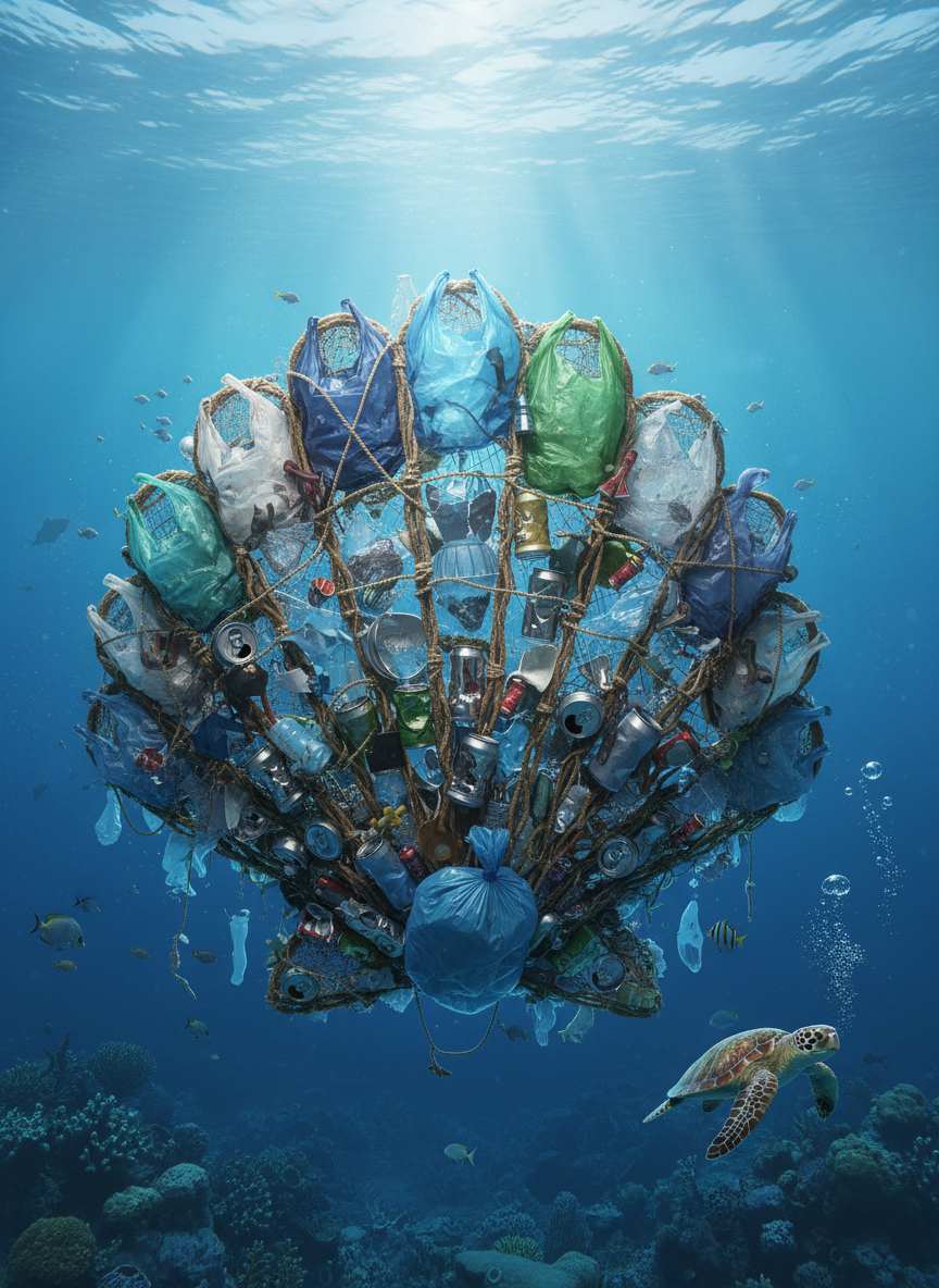 “A leatherback sea turtle entangled in a discarded ghost fishing net, with various consumer plastic fragments (water bottle caps, food wrappers) visible in the surrounding water column,” or “A close-up of zooplankton under a microscope, with colored microplastic fibers interspersed.”
