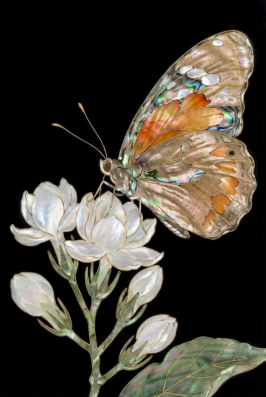 It is a specialized AI tool designed to create digital artwork that mimics the appearance of traditional pearl inlay or mother-of-pearl inlay craft. This involves simulating the process of cutting and setting lustrous, iridescent shell pieces into a contrasting dark substrate (like wood or lacquer) to form intricate patterns. It captures the key visual qualities: precise tessellation, play of light on polished shell, vibrant color shifts, and the deep contrast that defines this luxurious art form.