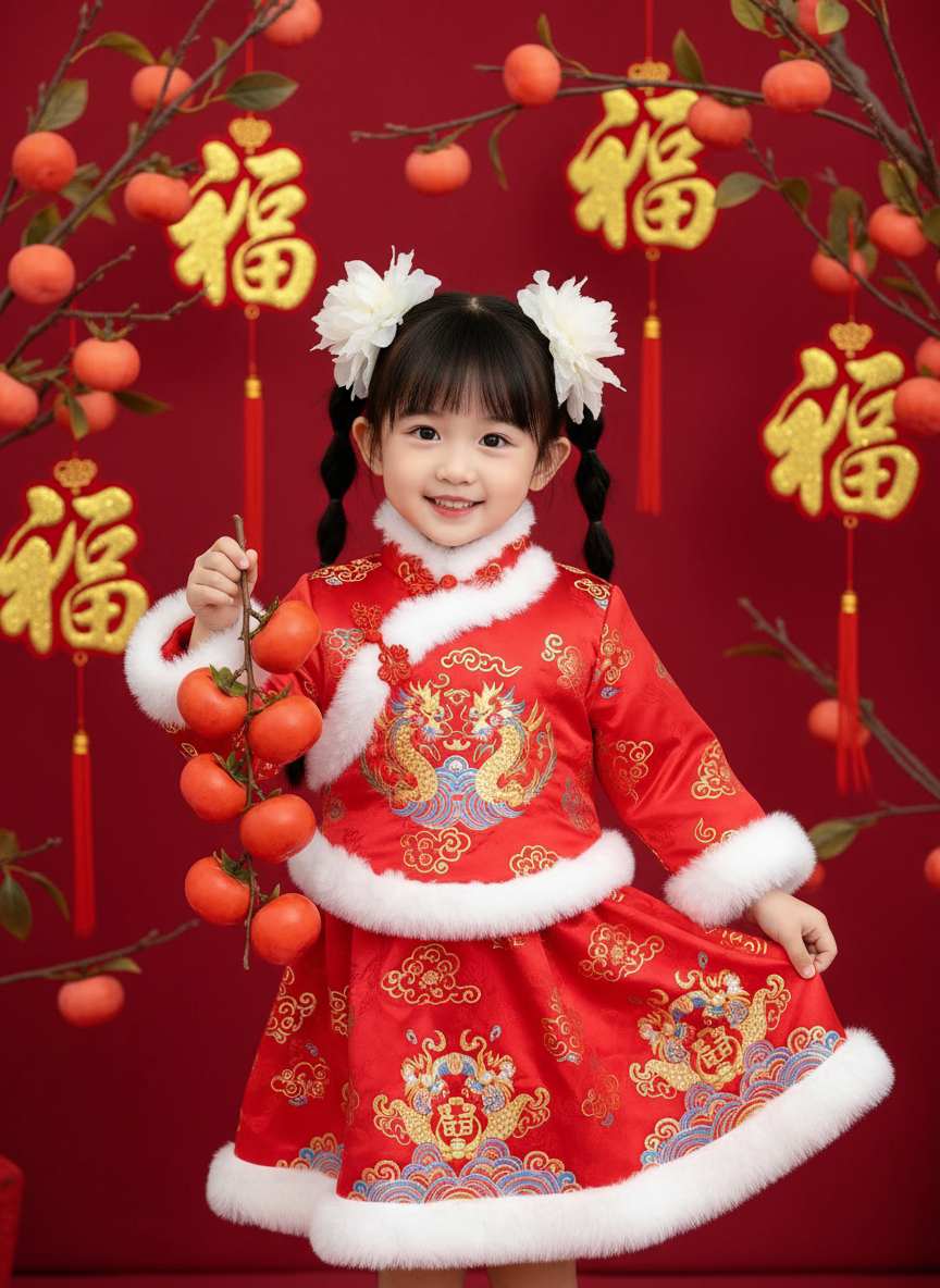 “Persimmon Perfection” here combines two ideas. “Persimmon” is a fruit deeply symbolic in East Asian cultures, especially during Lunar New Year, representing wishes for “good fortune” and “success in all matters” (due to a phonetic pun in Chinese). “Perfection” refers to creating an ideal, flawless, and aesthetically harmonious portrait that beautifully integrates this symbolic element with a person’s image for the New Year.