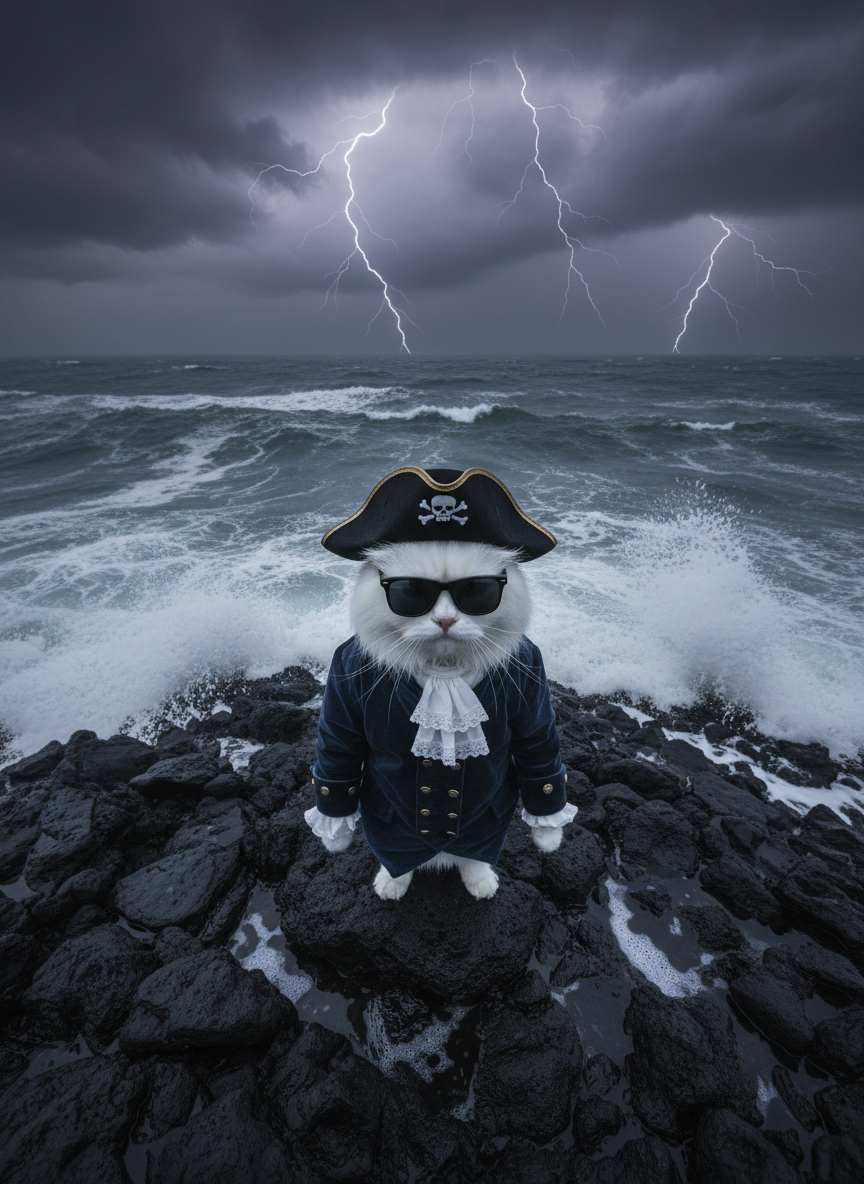 “A hyper-detailed portrait of a [Your Pet’s Breed] as a pirate captain. It has [describe markings: e.g., white paw] wearing a small leather tricorn hat and a red bandana, one eye covered with a patch. It’s looking defiantly at the camera, standing on the deck of a wooden ship, sunset in the background. Style: digital painting, cinematic lighting.”