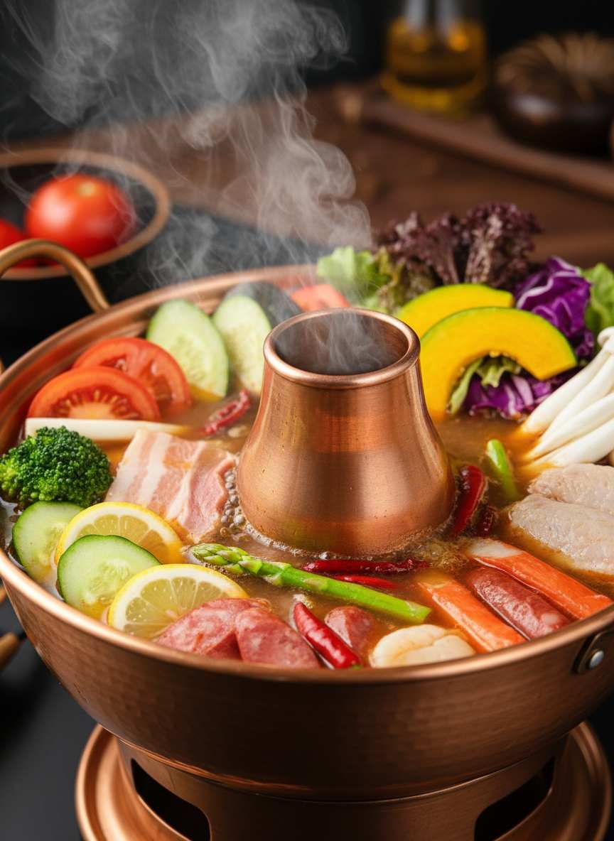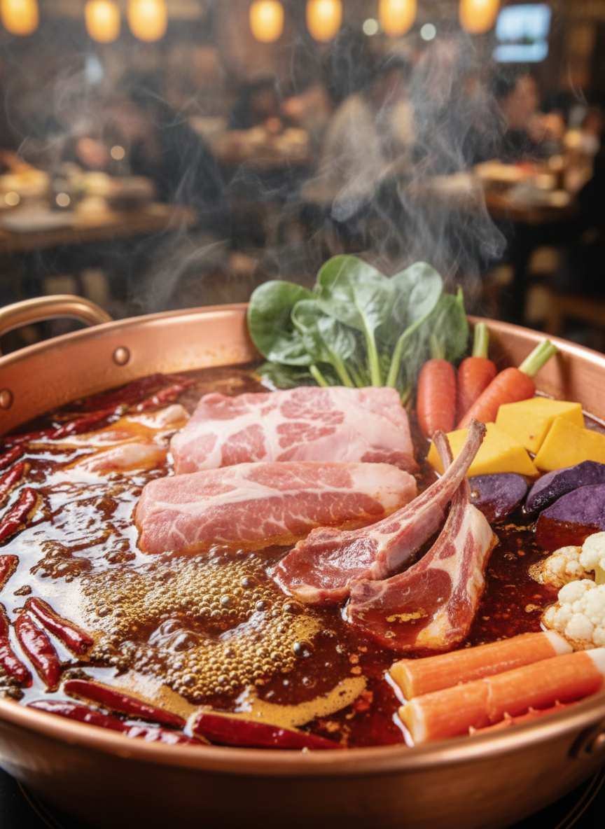 For Broth: “spicy Sichuan mala broth with floating chili peppers and Sichuan peppercorns,” or “clear, golden chicken broth with goji berries.”