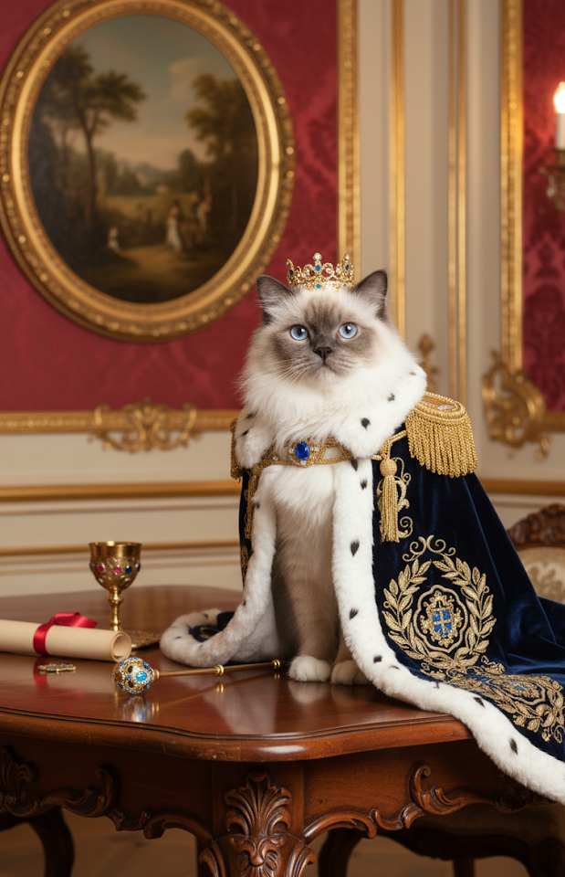 Clear, front-facing cat photos with good lighting produce the most accurate and detailed royal portraits.