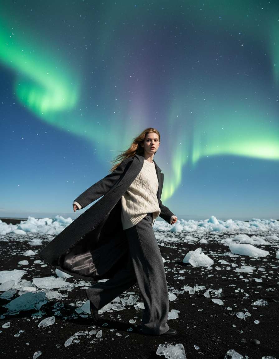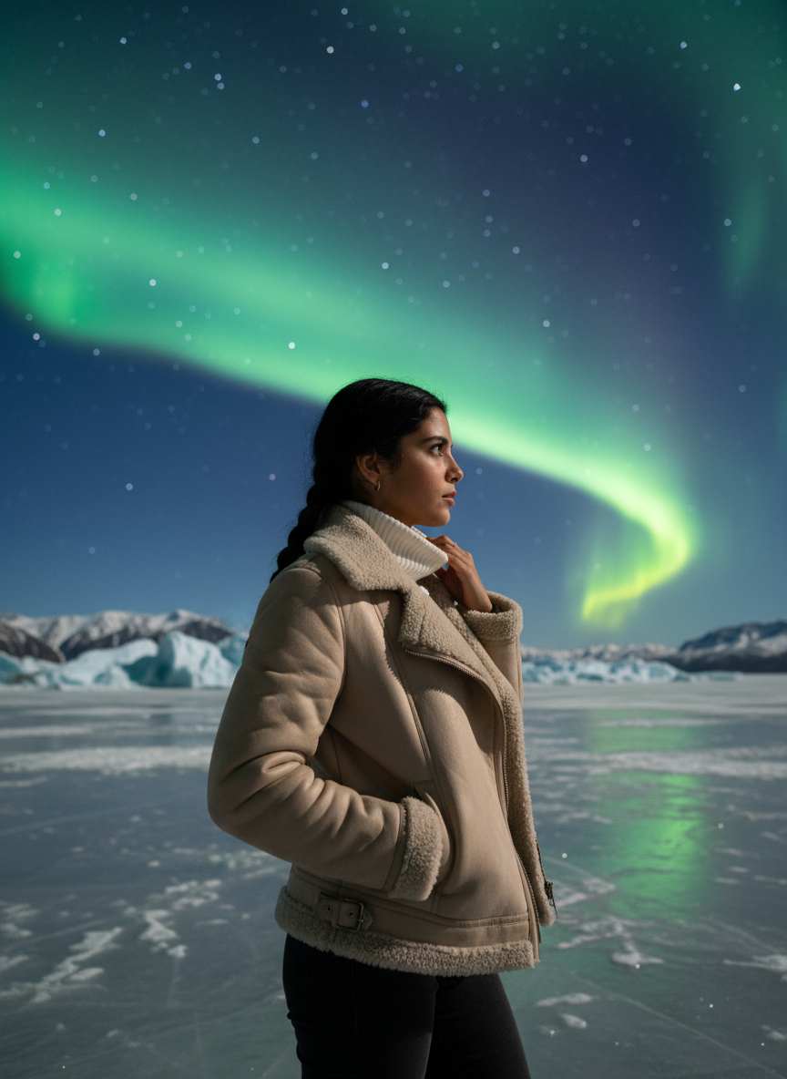 A type of portrait photography that focuses on the snow covered by auroras as the core scene, combined with the cold light of the polar night, the texture of ice and snow, and character modeling, to create a mysterious, ethereal, and dreamlike feeling. The core charm of this type of photography lies in capturing the fusion of natural wonders (aurora) and humanistic subjects, combining visual impact and artistic atmosphere.