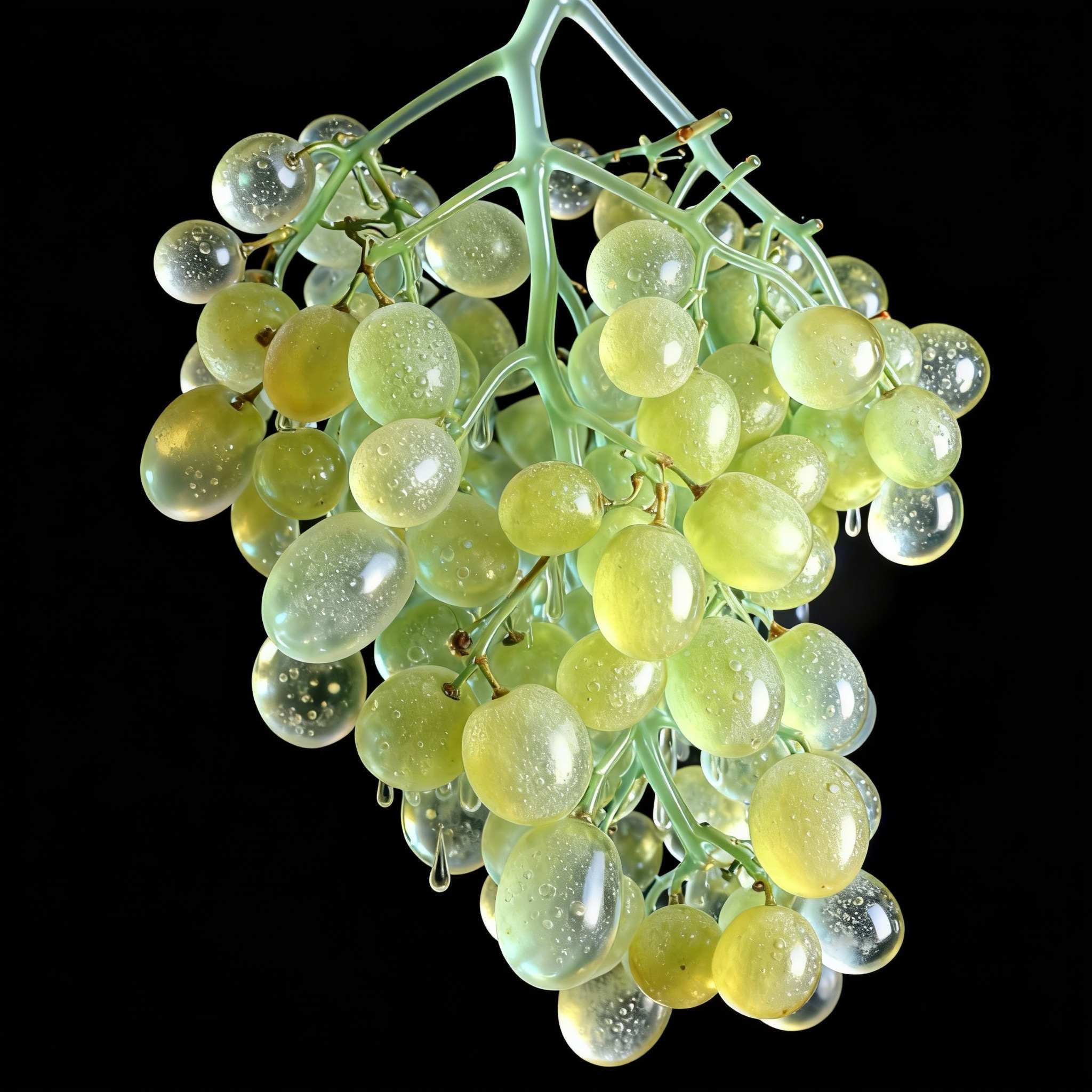 What is Translucent Glass Fruit Glowing Crystal Texture Light Refraction Minimalist Design High Detail Close-up Shot?