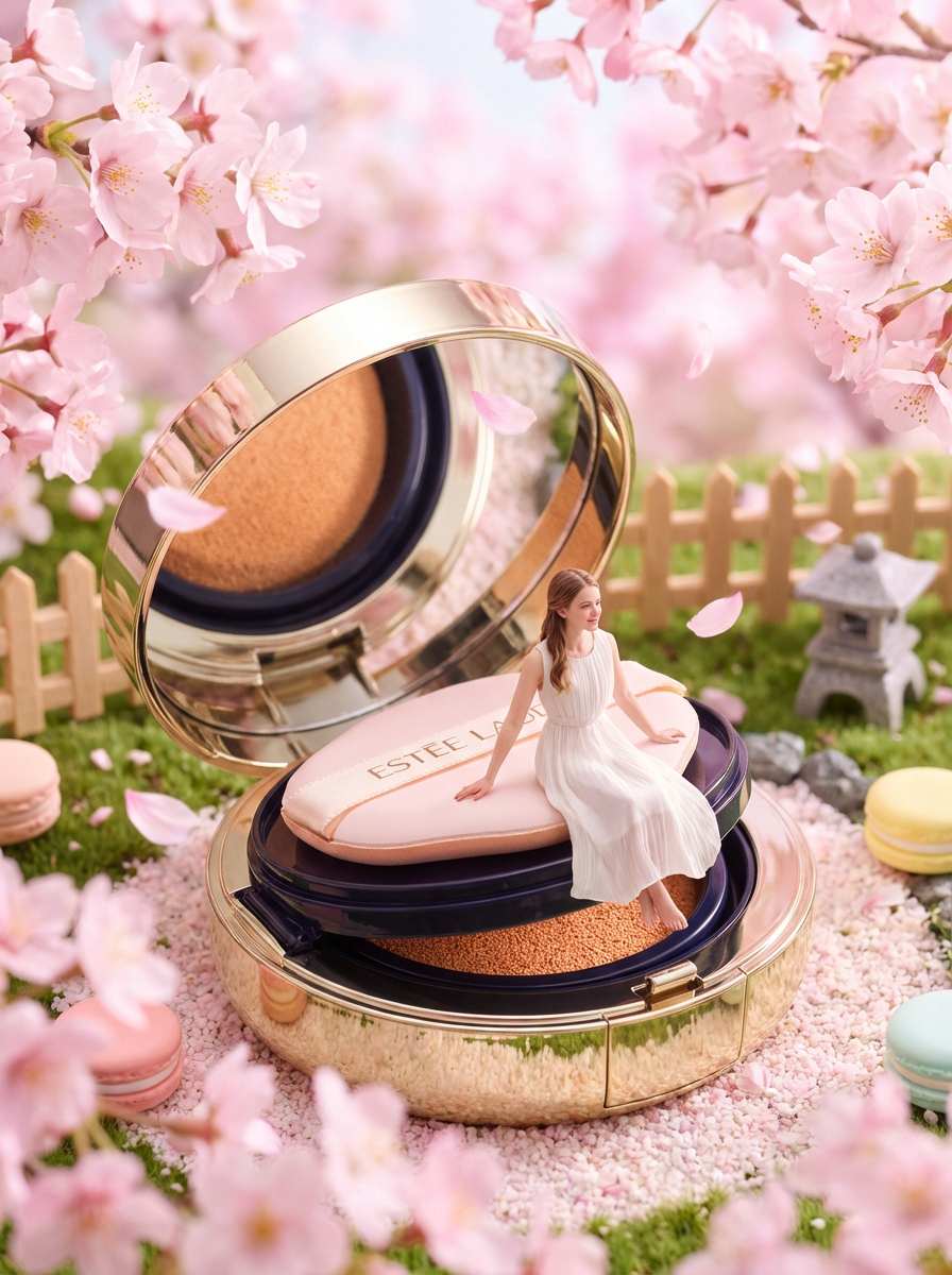 Core elements include oversized, realistic beauty products (with detailed textures like glossy lipstick tubes, frosted serum bottles, or matte skincare jars), intricate miniature worlds integrated around or atop the products (e.g., tiny people picnicking on a foundation compact, fairies tending a garden on a lip balm tube), bold, vibrant color palettes that highlight both product hues and miniature scenery, and poster-style composition (balanced framing, clear focal points, and visual hierarchy). The overall aesthetic balances beauty product realism with playful, imaginative miniature whimsy.