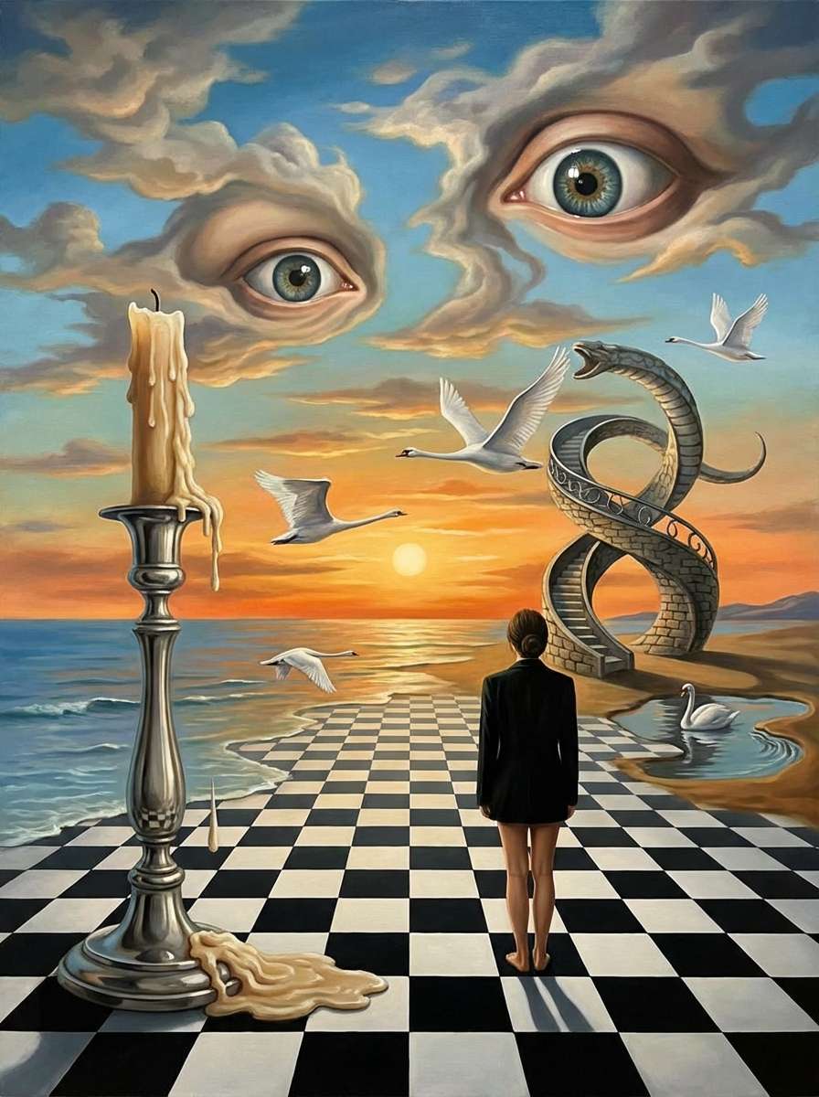 Yes. You can incorporate both Dalí’s classic symbols (elephants, eggs, ants, melting clocks) and custom whimsical symbols (e.g., floating cupcakes, giant teacups, playful mythical creatures) into the design. The AI will integrate these motifs seamlessly into the surreal landscape, maintaining the Dali-style distorted perspective and dreamlike atmosphere while adding your unique touch.