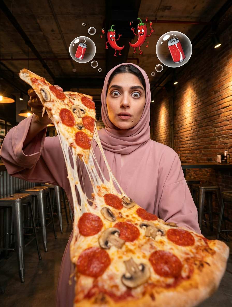 This style features a dramatically expanded foreground that makes the food plate appear larger and closer to the viewer, while stretching and warping the background elements (including your own face and the restaurant setting) toward the edges of the frame. This creates a fun, immersive, and spatially exaggerated effect that adds energy and a sense of "being there" to a standard food photo.