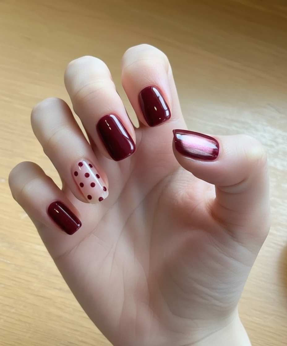 The prompt clearly states 'nail texture is [matte / glossy], decoration is [silver snowflake patterns with small rhinestone embellishments],' with additional specifications 'red shades are [wine red / strawberry red], nail shape is [square-rounded / almond],' ensuring the results meet the requirements.
