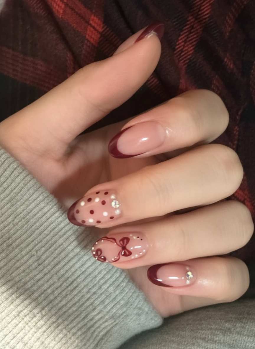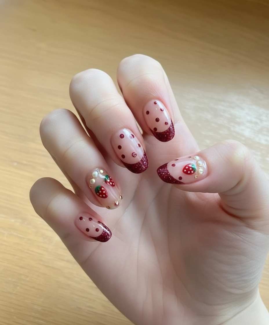 How can AI accurately depict the texture of winter red nail art (such as matte/glossy) and the decorative details (such as rhinestones/snowflakes)?