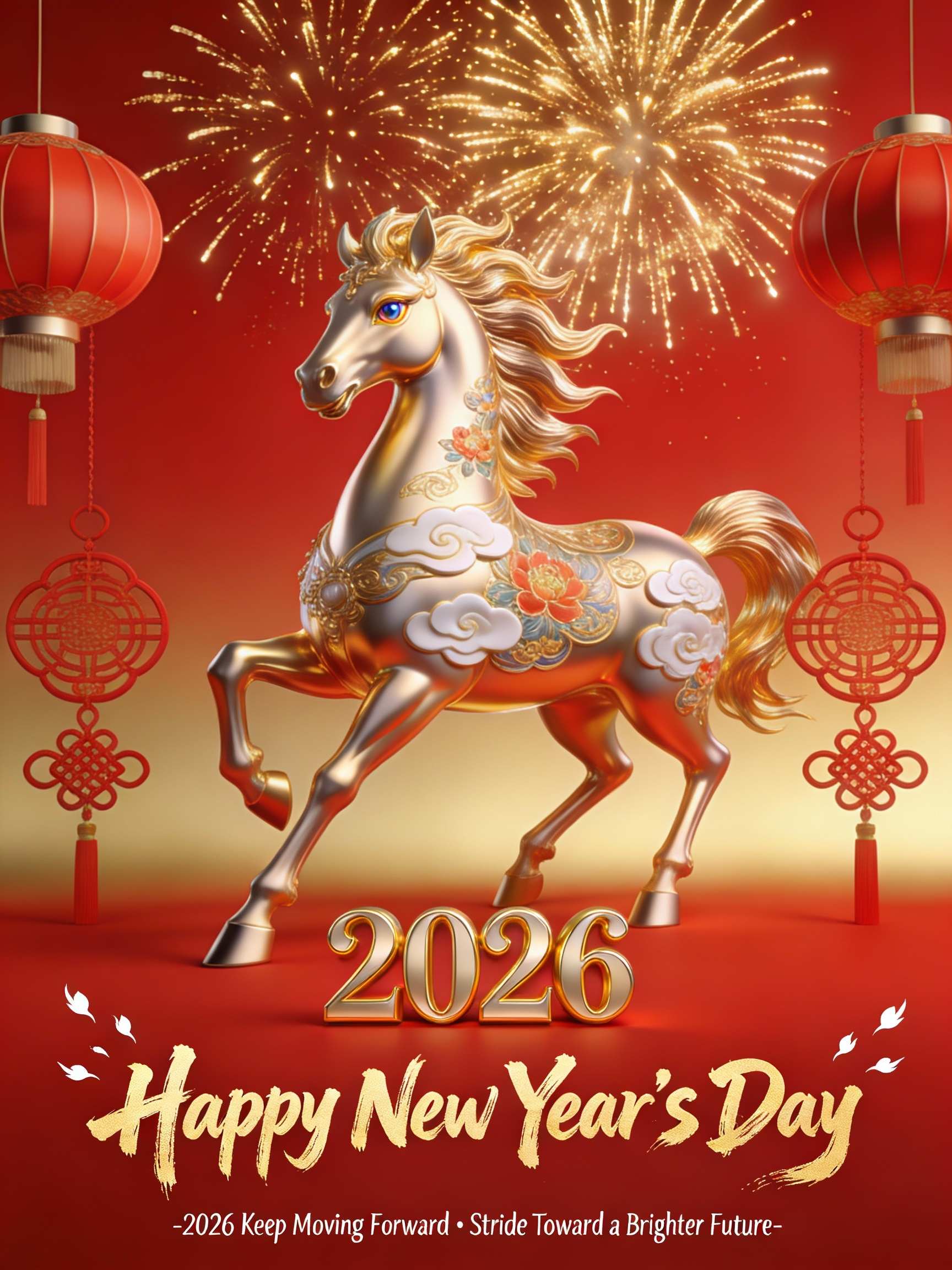 Metaphorical: “An illustration of a horse leaping over a traditional Chinese gate, symbolizing overcoming obstacles in the new year. Dynamic and powerful.”