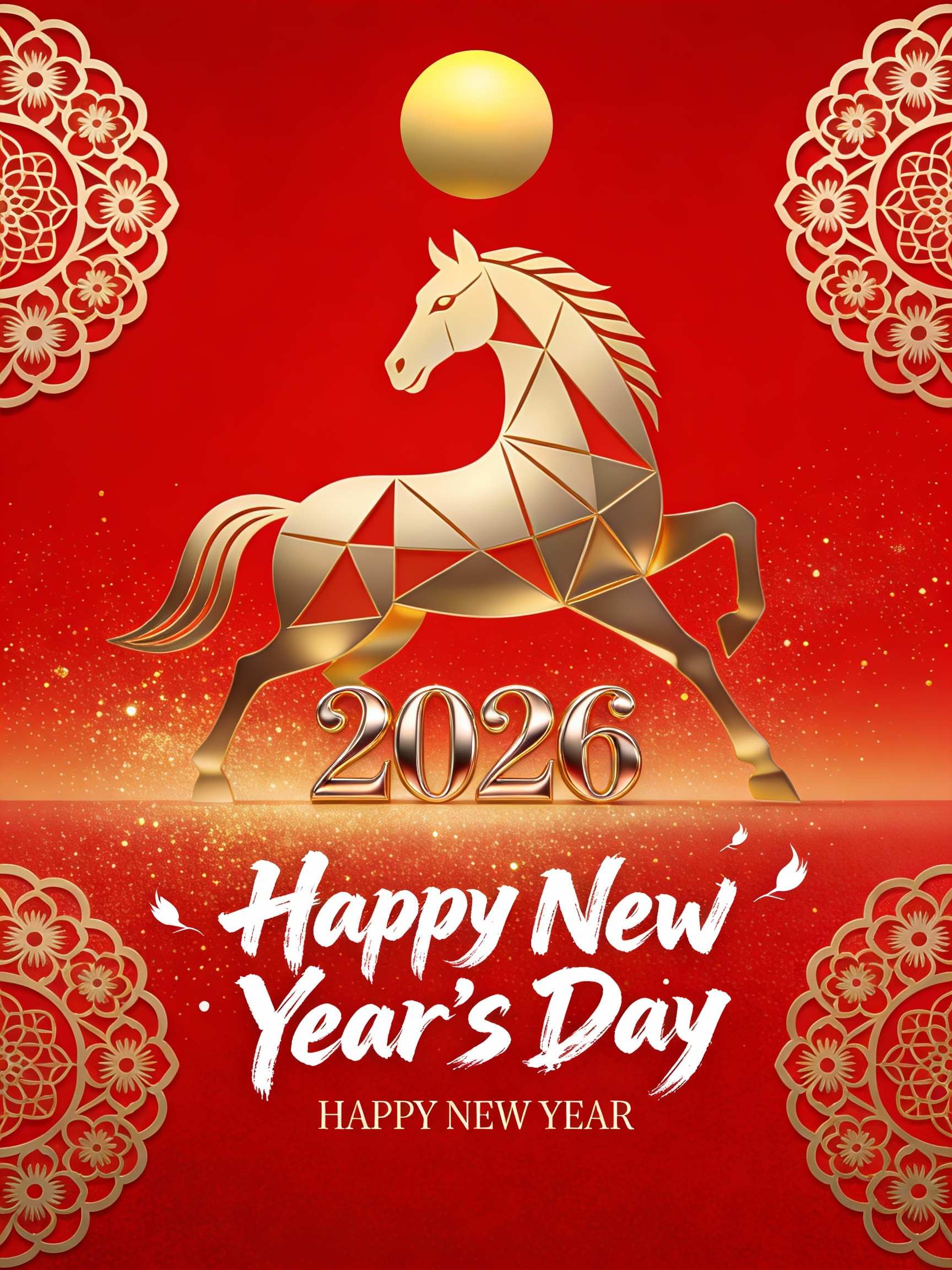 For Art Deco: “A Year of the Horse poster in bold Art Deco style. A stylized, geometric horse profile in gold and black, with sunray patterns and sleek lines. Elegant and luxurious, 1920s aesthetic.”
