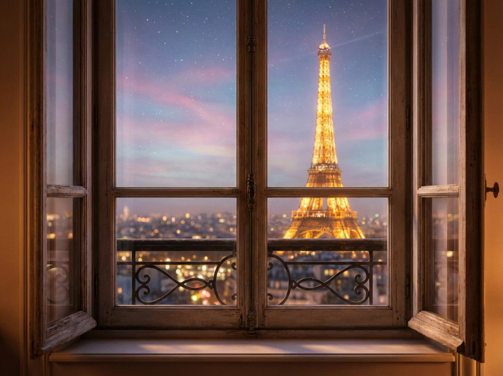 Prompt: Haussmann-style apartment window frame, view of the Eiffel Tower illuminated in the distance at night, soft city lights glowing, starry sky with subtle pastel hues, romantic and ultra-realistic, highly detailed textures, projection-friendly composition, focus solely on the window view, sharp edges, cinematic lighting, cozy nighttime ambiance.