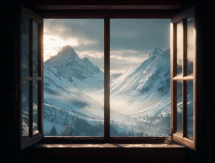 Prompt: Chalet window with snow-covered mountain peaks, dramatic morning light, misty valley, ultra-realistic landscape, cozy winter ambience, projection-ready framing.