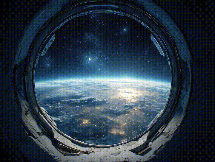 Prompt: Circular space station window, Earth view with glowing blue atmosphere, stars in background, high-detail, realistic NASA-style lighting, projection-ready composition.