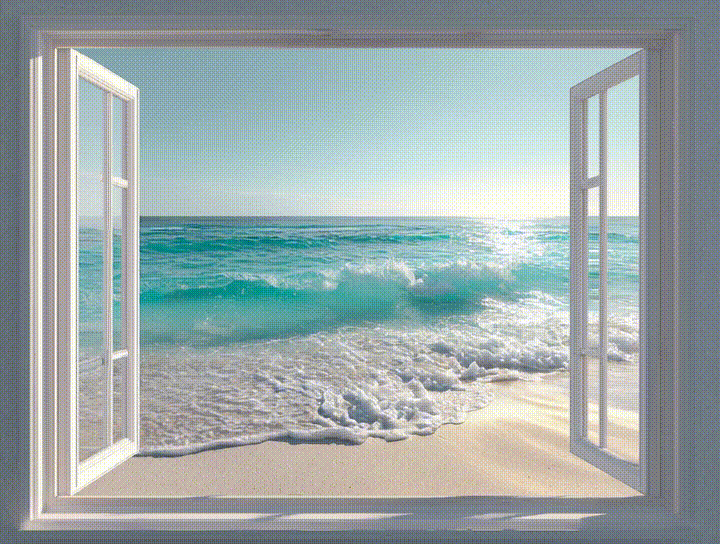 Prompt: Minimal white window frame overlooking turquoise ocean waves, soft sunlight, calm sandy beach, realistic reflections, ultra-clear projection-ready composition.