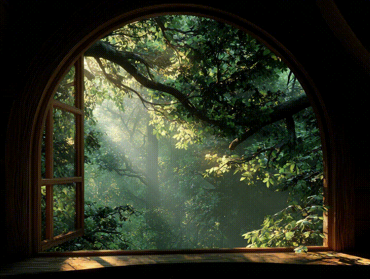 Prompt: Treehouse window looking into dense green forest, sun rays through leaves, serene and natural, ultra-realistic detail, soft shadows, projection-ready composition.