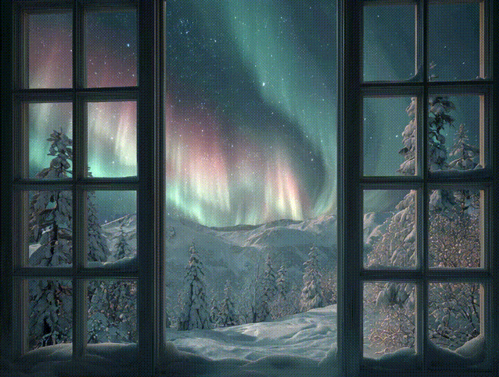 Prompt: Window view of snowy landscape with northern lights, soft glowing aurora colors, peaceful winter night, ultra-realistic, projection-friendly, high-resolution.