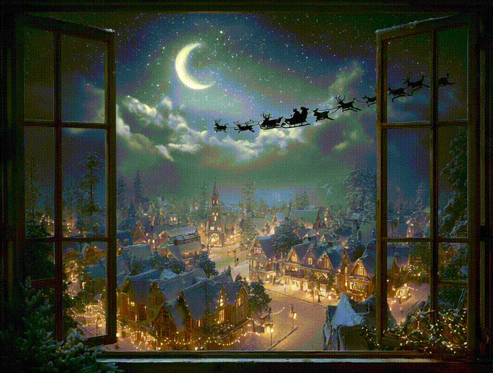 Prompt: Window view of snowy town at night, Santa Claus sleigh flying across starry sky, glowing Christmas lights, cinematic magical style, ultra-realistic, projection-ready.