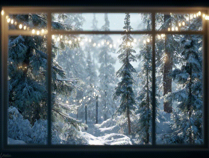 Prompt: Snowy pine forest outside window, soft Christmas lights glowing on trees, morning light, cozy and peaceful, realistic textures, projection-friendly framing.