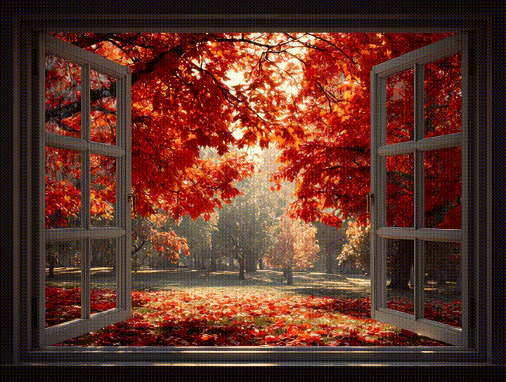 Prompt: Window frame overlooking an autumn park, vibrant red and orange leaves on trees, fallen leaves scattered on the ground, soft sunlight filtering through branches, cozy and ultra-realistic atmosphere, projection-friendly composition, focus solely on the window view, sharp edges, cinematic lighting.