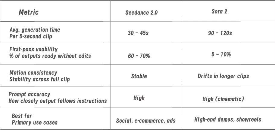 Seedance 2.0 is noticeably faster and built for volume — social content, product videos, quick turnarounds. Sora 2 takes longer per generation, and only about 5–10% of outputs are usable without tweaking something first.